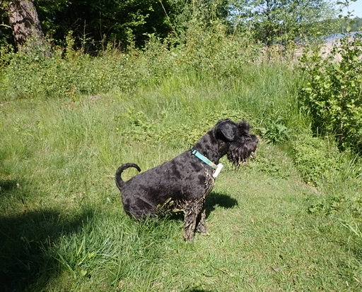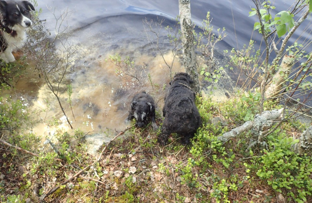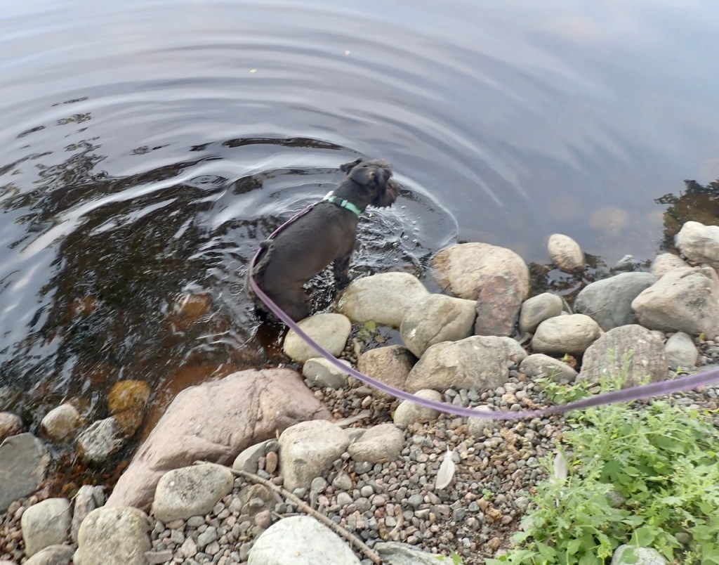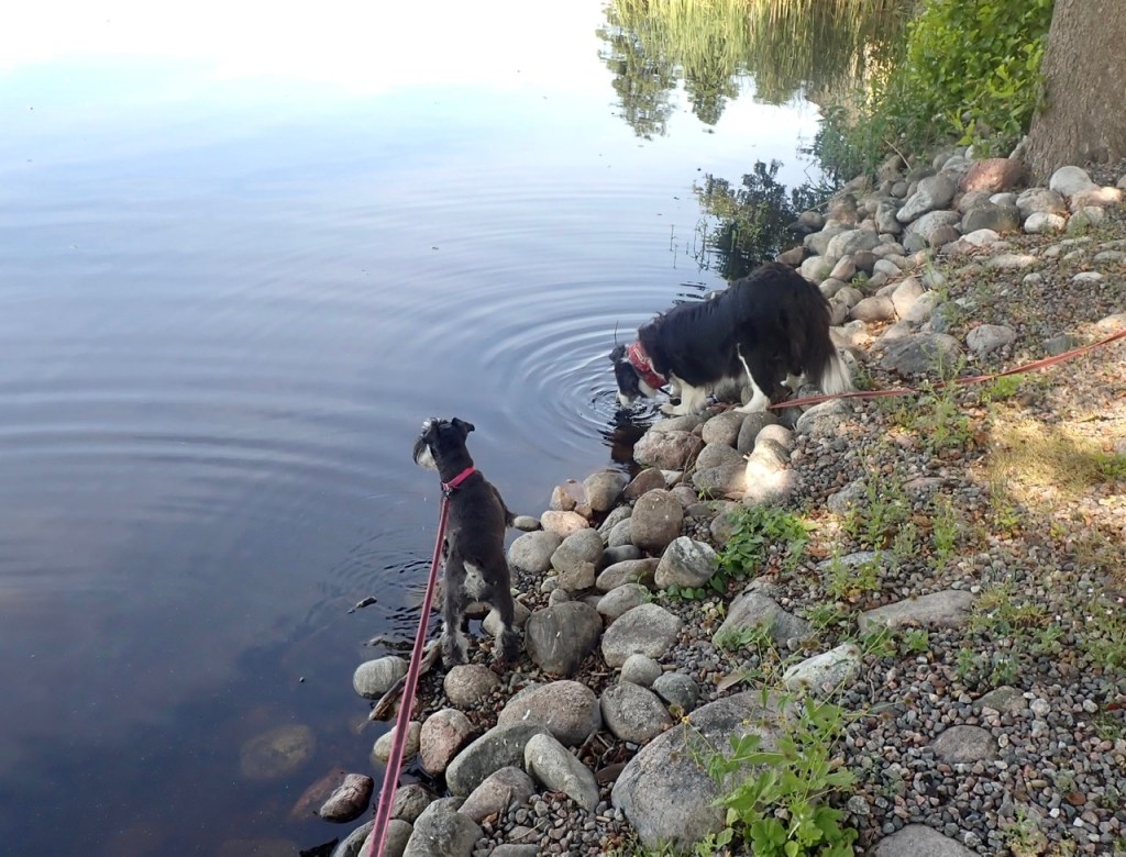 Nu är det sååå varmt till och med matte var i och badade. Hon och Troy var onödigt långt ut tycker jag som höll mig i strandkanten och bara gick i med tassarna. Tvärs över sjön åt det håll Troy tittar finns Tommys badstrand. Undrar jag om han tänker simma iväg dit för att se om Basse är där och badar.