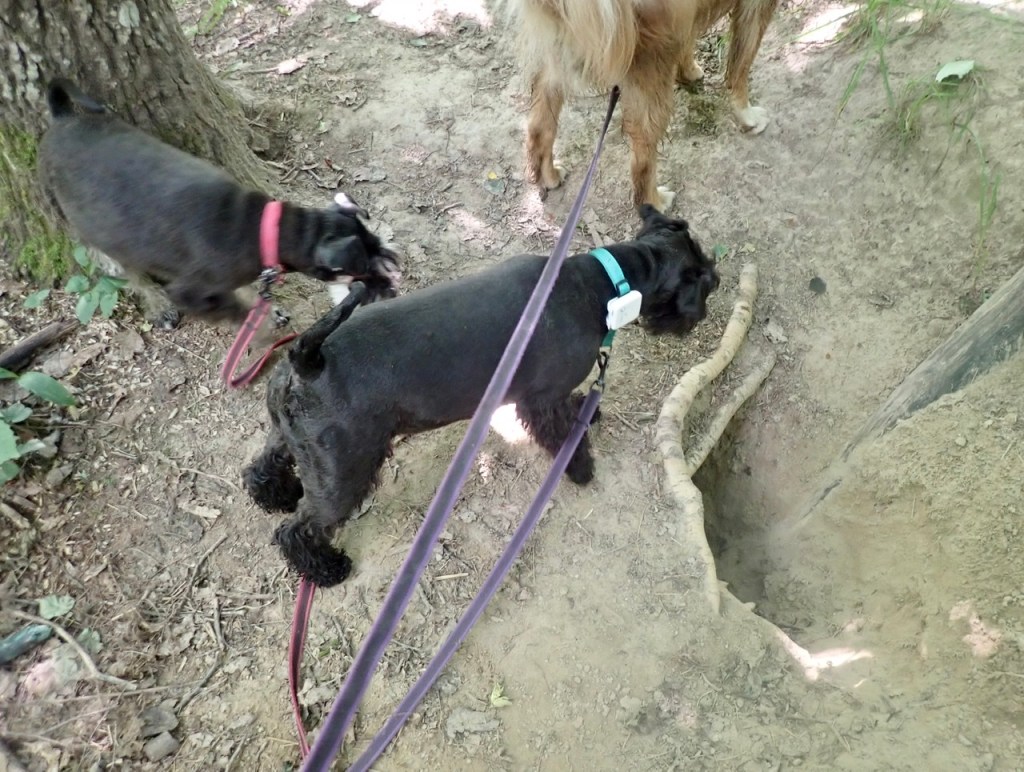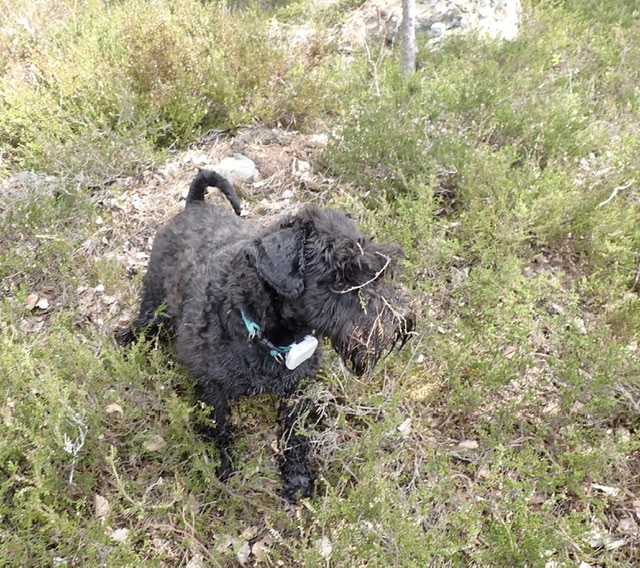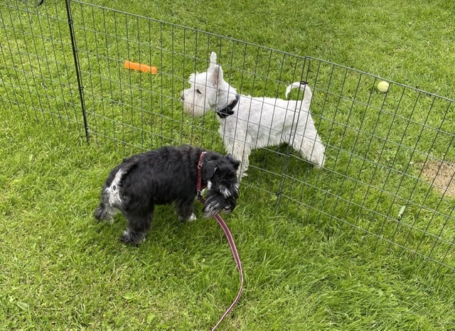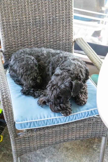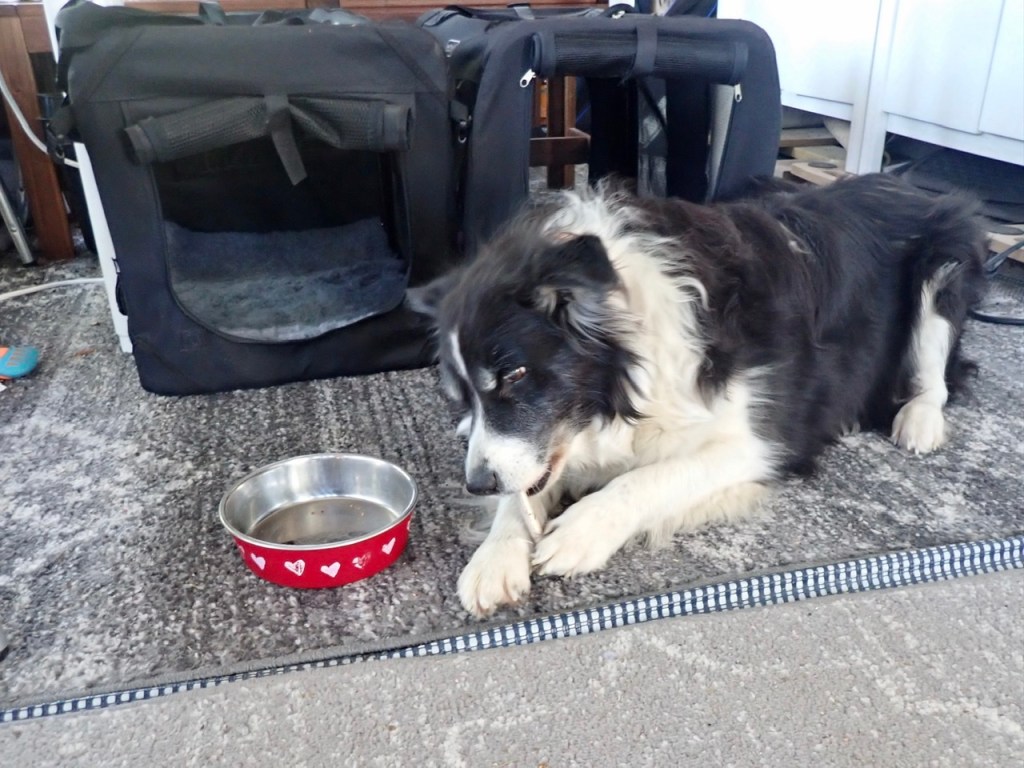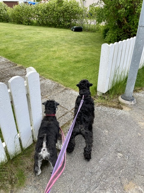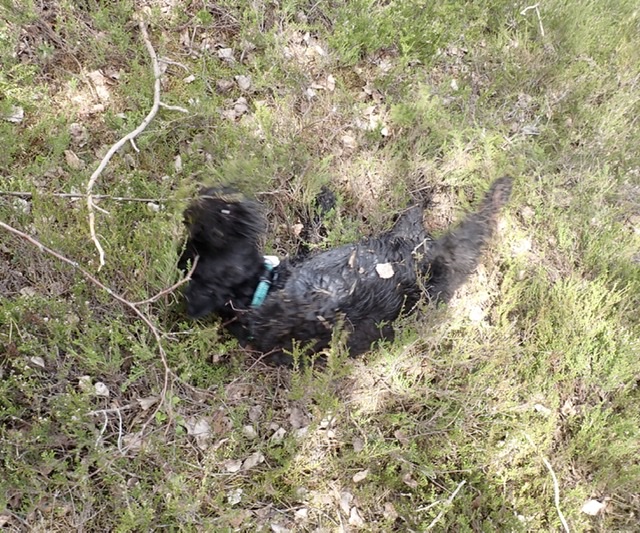 På nattpinket gick vi utanför campingens staket och plötsligt kom en terriertjej kutandes med kopplet hängande efter sig. Vi stod en stund och snackade med henne, hon var en juste brud. Troy blev väldigt förtjust i henne och hon i honom. Efter ett tag kom hennes matte och så blev hon koppelfånge. De hade inte märkt att hon stack iväg från husvagnen, det tog en liten stund innan de saknade henne. Matten var glad att vi kom och att hon stannade hos oss.