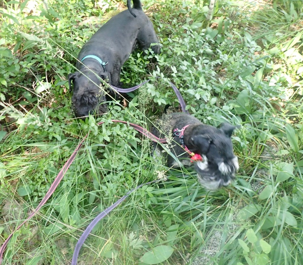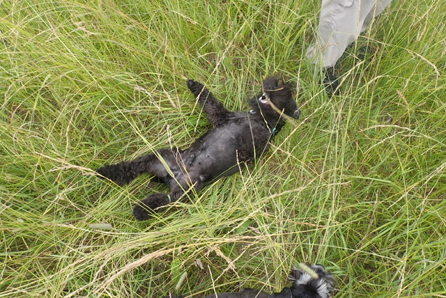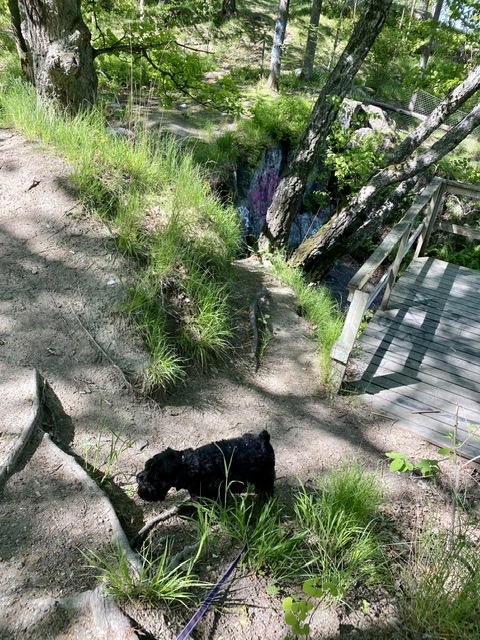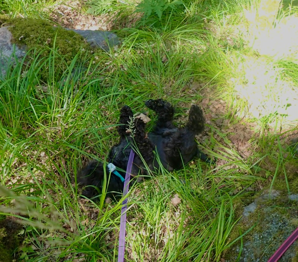 Nä nu går jag inte längre, det är för varmt. Jag lägger mig i det lite fuktiga gräset här i skuggan och svalkar mig. Du får ringa efter husse så han tar min bil och kommer och hämtar oss!