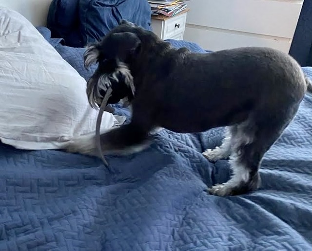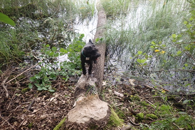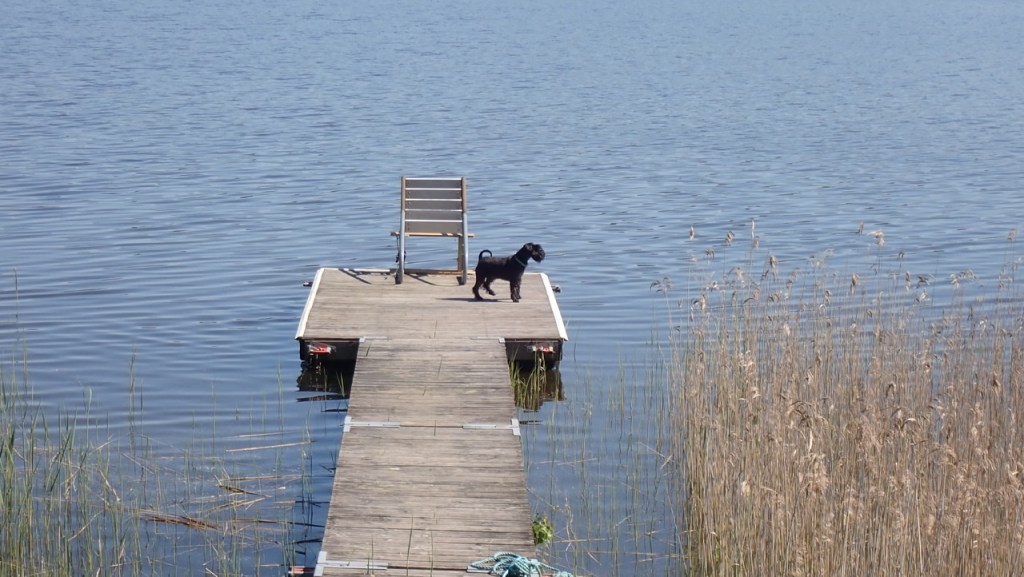 Nu va. Nu är det jag som har pinnen och den skall inte i sjön igen. Nu skall jag tugga lite på den.