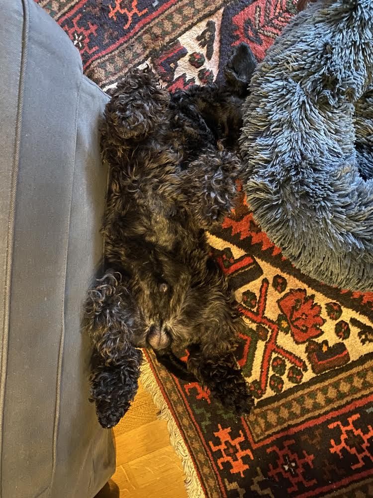 Väl hemma i vagnen åkte vi på en tass- och skäggdusch i hundduschen för att försöka få bort lera och tillsammans med kardan få bort de nedrans kardborrarna. Efter duschen käkade vi lite kycklingkex sen tog vi en vilostund i våra mysiga gosiga korgar. Zzzzzzz
