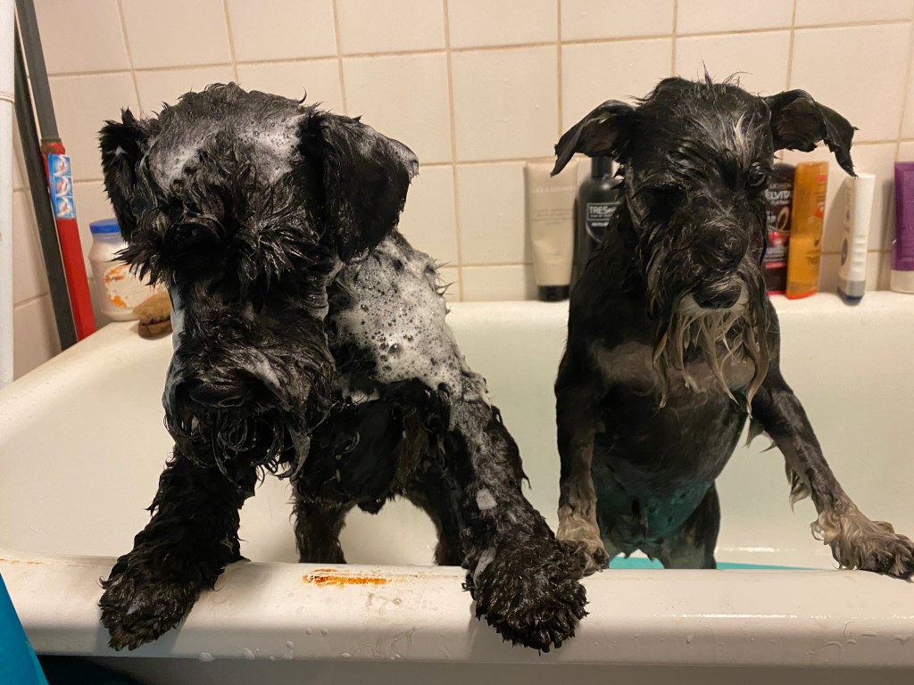 Vilken start på veckan. Vi åkte i badkaret och hela jag blev inlöddrad, likaså Troy. Matte påstår att vi är leriga efter snuzzepromenaden vid Åkeshov. Sen snackar hon om att det måste klippas rent mellan trampdynorna å då måste det vara rent där. Viket hot va, det är ingen ände på förskräckelsen. När man står här i sitt elände kommer husserazzi med kameran, kan det bli värre? Matte snackar om att badet var nödvändigt för vattnet är grå-svart!