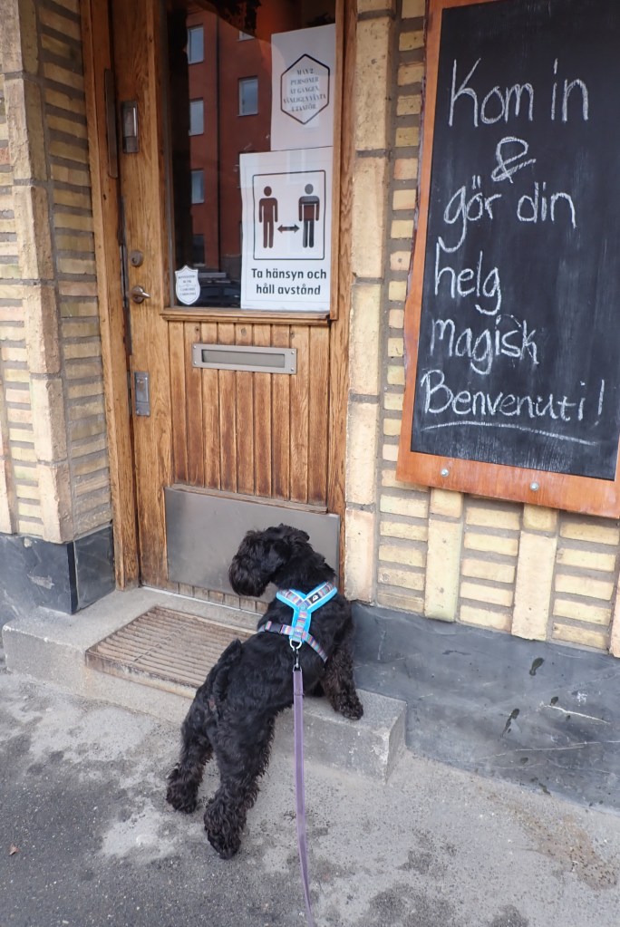 Årets första besök på ett café vid fågeltorget, dom har fina utomhusplatser. Matte är väldigt bestämd i att man måste sköta sig när man är på café, dvs sitta fint. Inte jaga duvor eller tigga av de som sitter vid borden intill. Det är ett bra ställe tycker vi, de kom ut med en skål kallt friskt vatten vilket vi verkligen behövde efter kutandet i rastgården. Vi fick smaka lite på mattes panini och det var gott. Vi ser fram emot flera café besök i sommar.