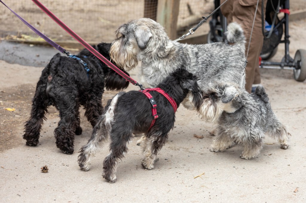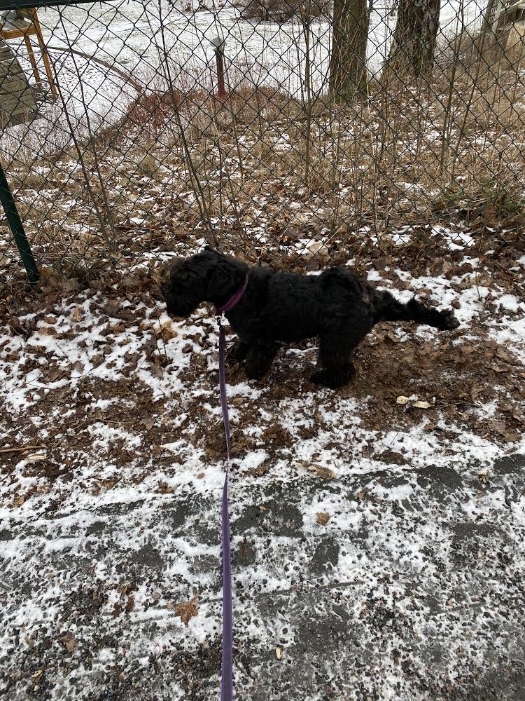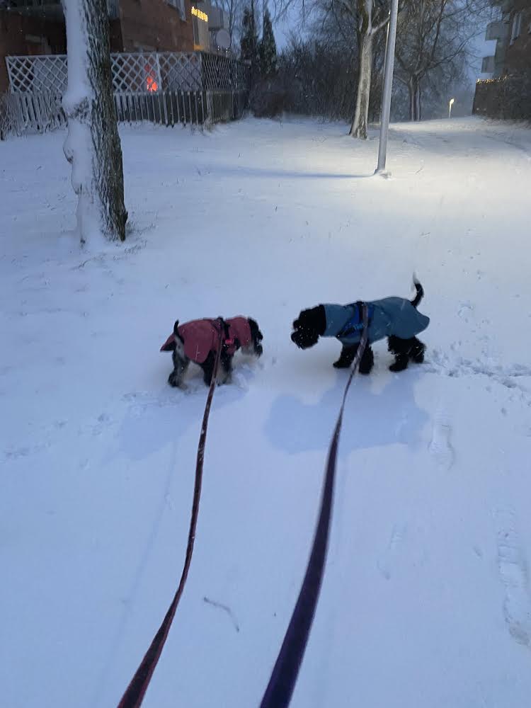 När vi möter andra snuzzar är vi väldigt glada. Ella är en mellan schnauzer men Troy tycker att hon är väldigt stilig. Hon är 7 år och uppträdet värdigt när vi möts men efter att Troy fjompat sig för henne vill hon plötsligt leka. Jag är mer intresserad av killen som är fem år och där min förvirrade matte glömt vad han heter. Alltså hur kan man glömma något så viktigt va, kammar och borstar glöms inte bort.