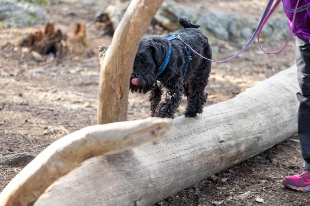 Troy undrar om vi skall gå balansgång på den omkullfallna trädstammen men matte tycker att det är för snårigt där