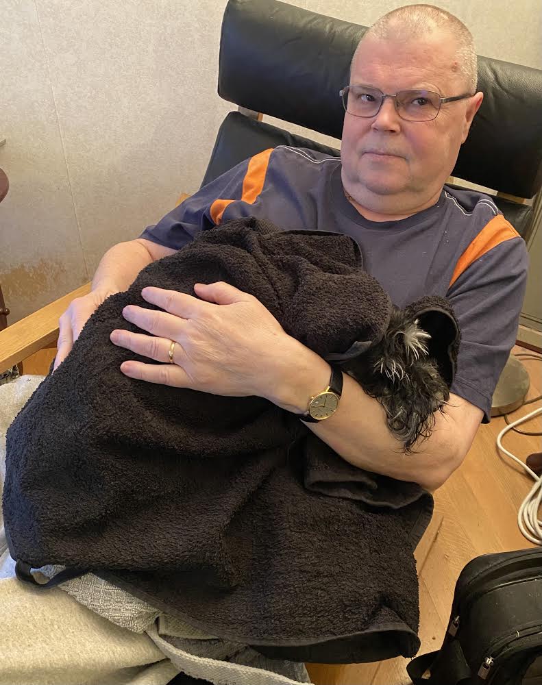 Efter badet fryser jag som tusan! Då är husse och ett gäng badlakan bra. Troy blir blåst av rymdpistolen, den hatar jag.