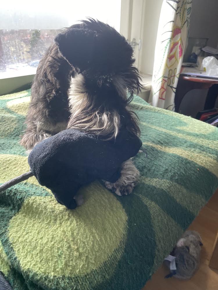 För Råttis har jag en daglig rutin. Efter att matte har bäddat och vi har ätit frukost gräver jag fram honom från hans sovplats. Nu skall han flyttas till dagplatsen.