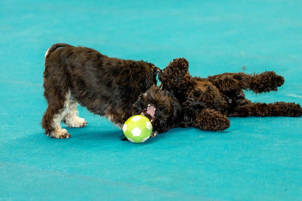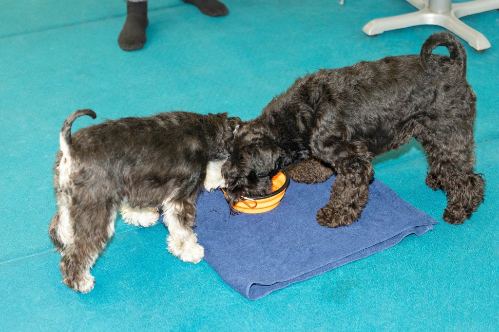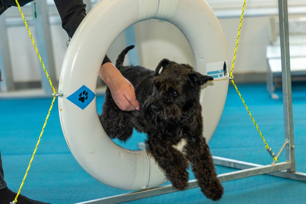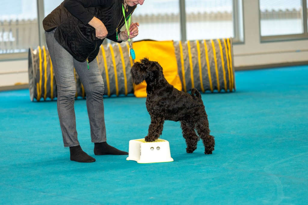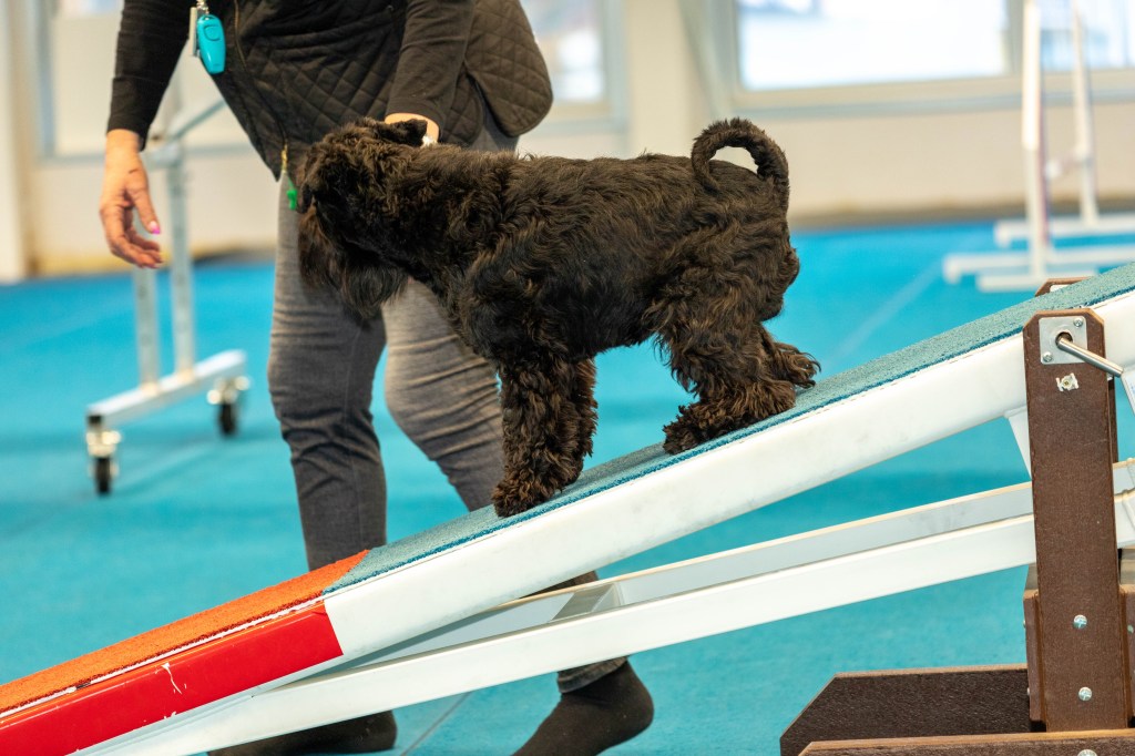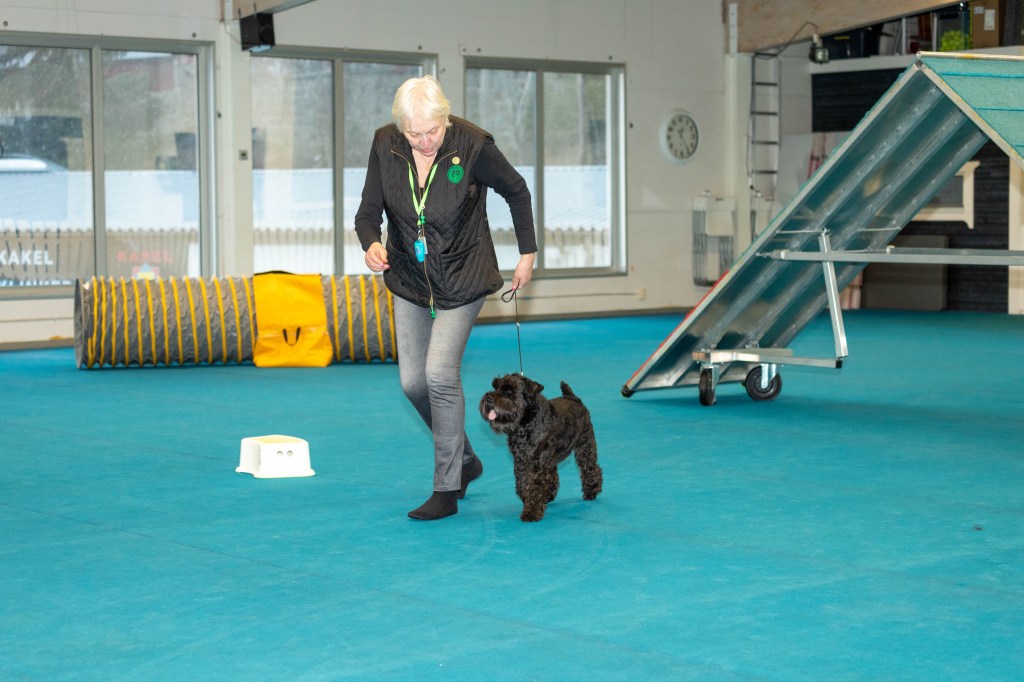 Vi tränar också att gå fint i utställningskoppel och att stå fint på trimbordet. Det är en timme som är fullspäckad med aktiviteter.