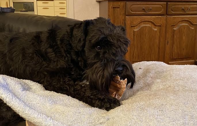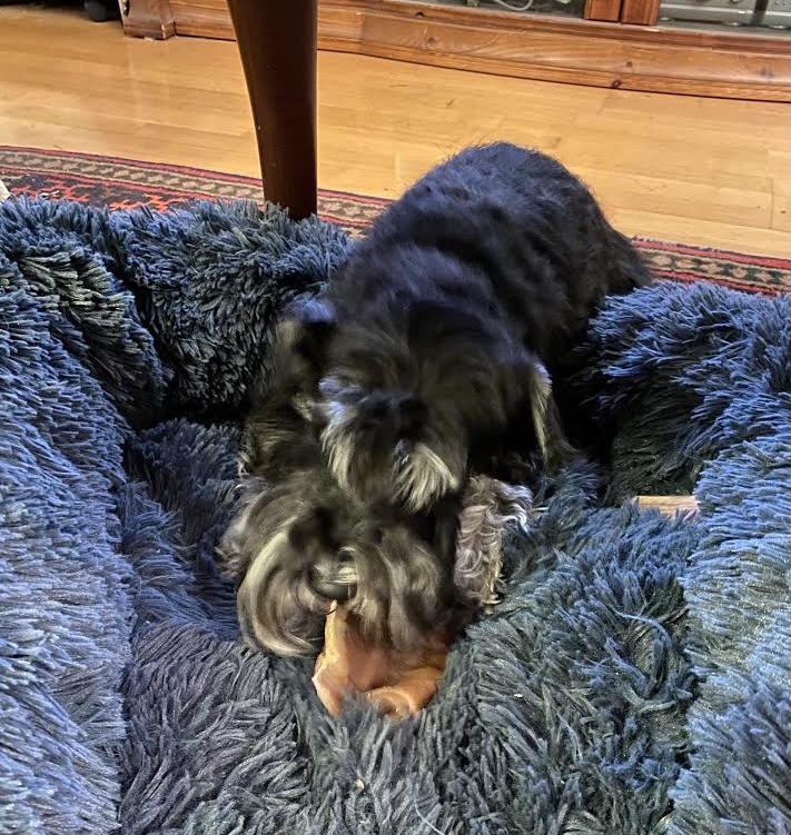 Mums med en Dentastick efter promenaden. Matte tycker jag är skicklig på att hålla i saker jag vill gnaga på. Det beror på att jag fick ben redan som väldigt liten valp.