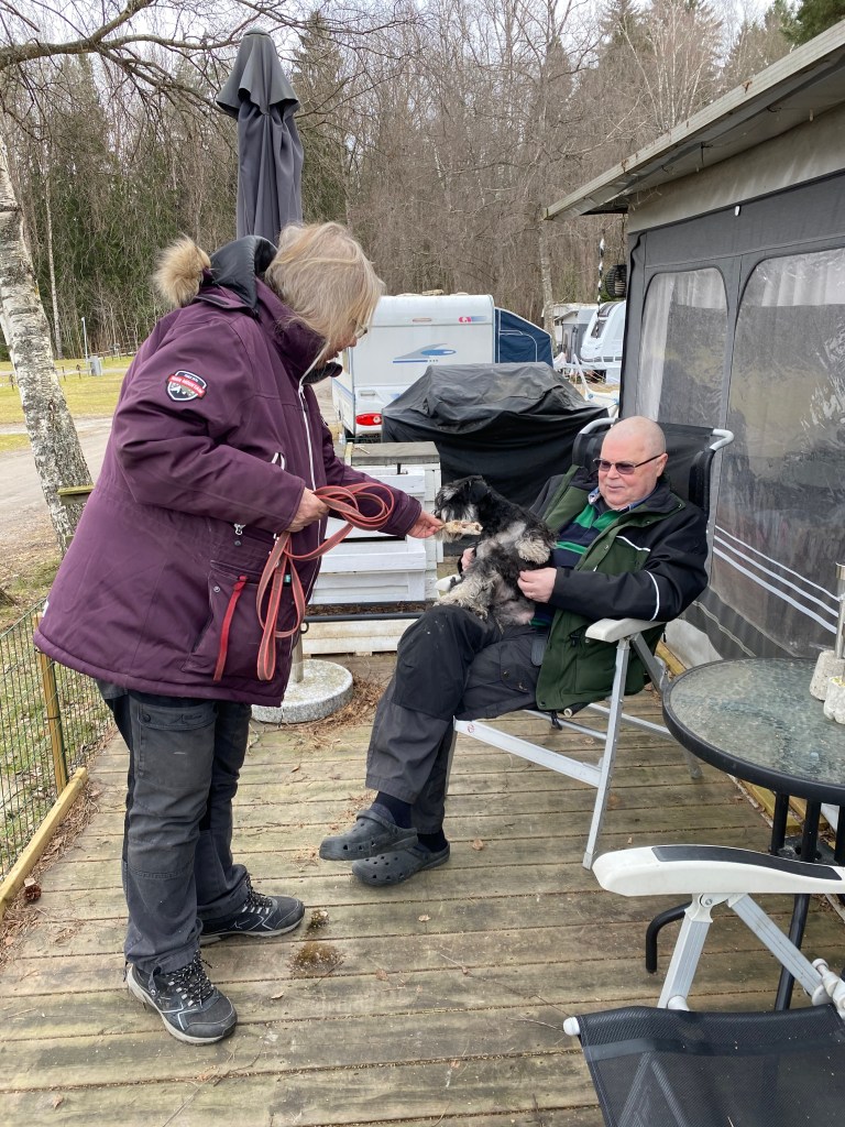 Det är mycket att vårfixa i förtältet, på trallen och tomt. Det börjar komma grannar som också håller på med vårfix med sina vagnar och tomter. Det är väldigt bra grannar för de kommer till vår plats och hälsar på oss. Vi gillar alla grannar men vissa lite mer. Micke som bor tvärs över ”gatan” gillar vi verkligen.