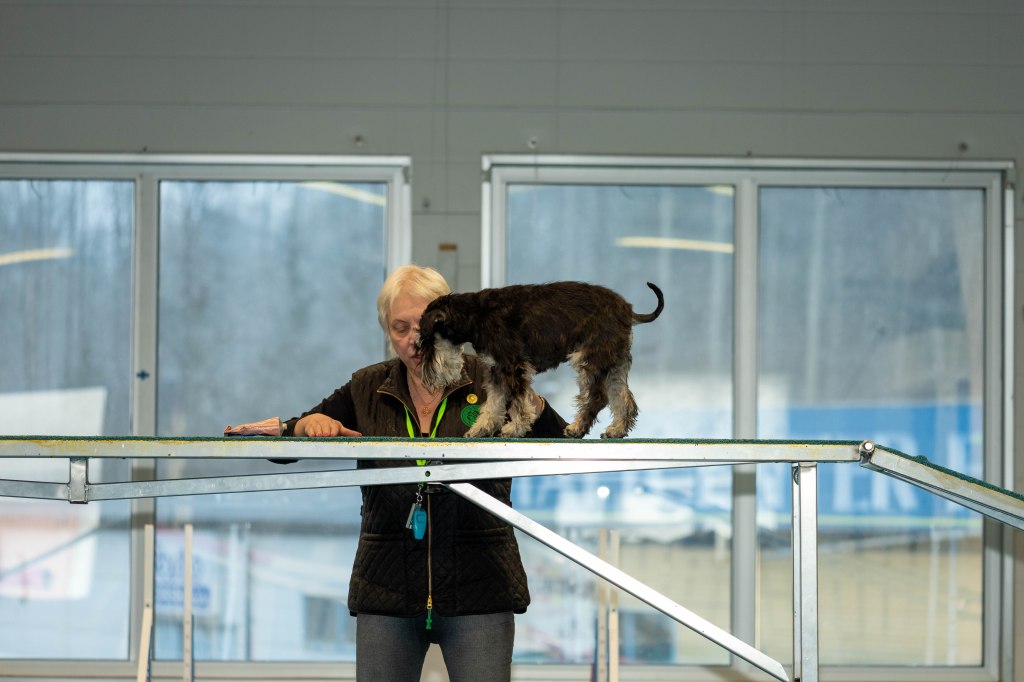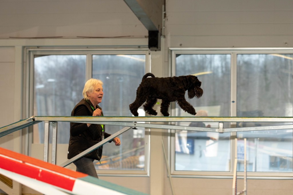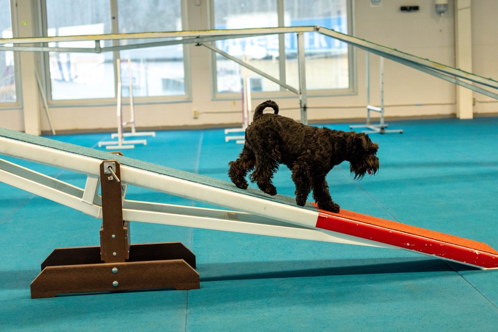 När matte och husse ställt fram alla hinder har Troy redan börjat med vippbrädan själv för han är verkligen på. Vi kör ett pass på vippbräda, höga bron, långa tunneln, dubbelt hopp hinder, pallen där man skall ställa upp framtassarna, slalombanan och stå övning på trimbordet och titta på tänder och känna på kroppen. Lite sitt , stå och ligg kör vi också! Sakta, sakta manar matte du skall hela vägen ned till det röda fältet, inte hoppa