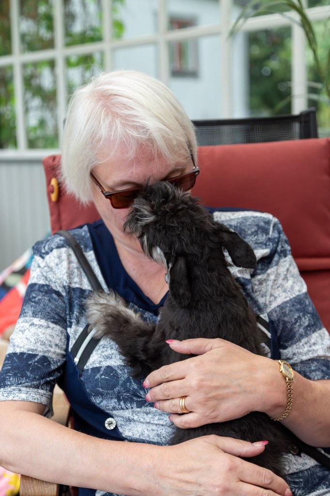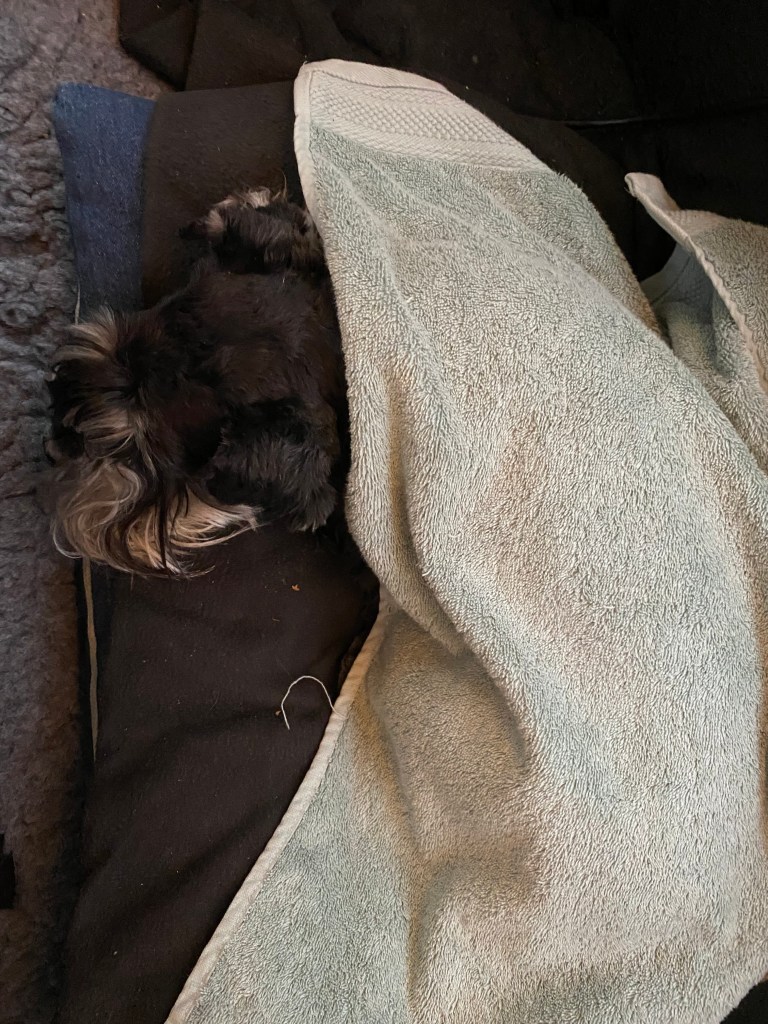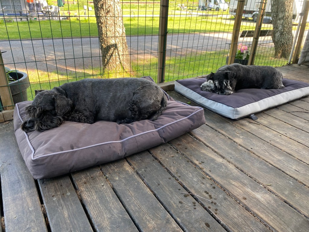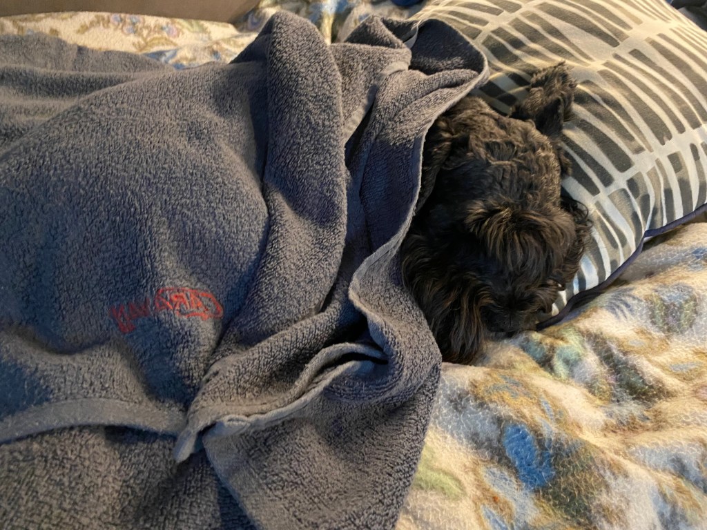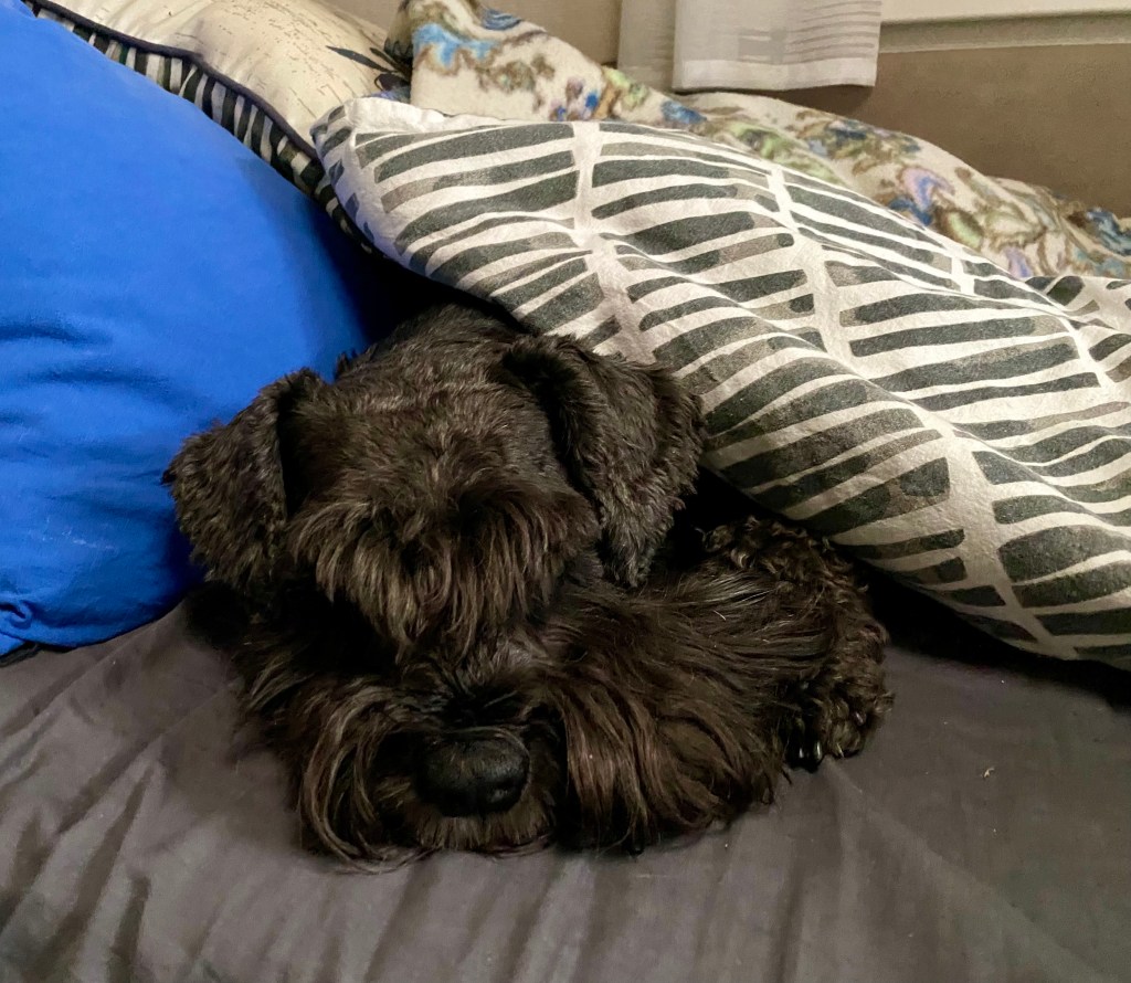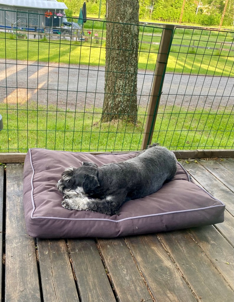 Nu vill jag vara ifred. Att gå spår och rusa genom högt gräs är tröttande. Troy lägger sig på mattes kudde och somnar gott. Zzzzzz
