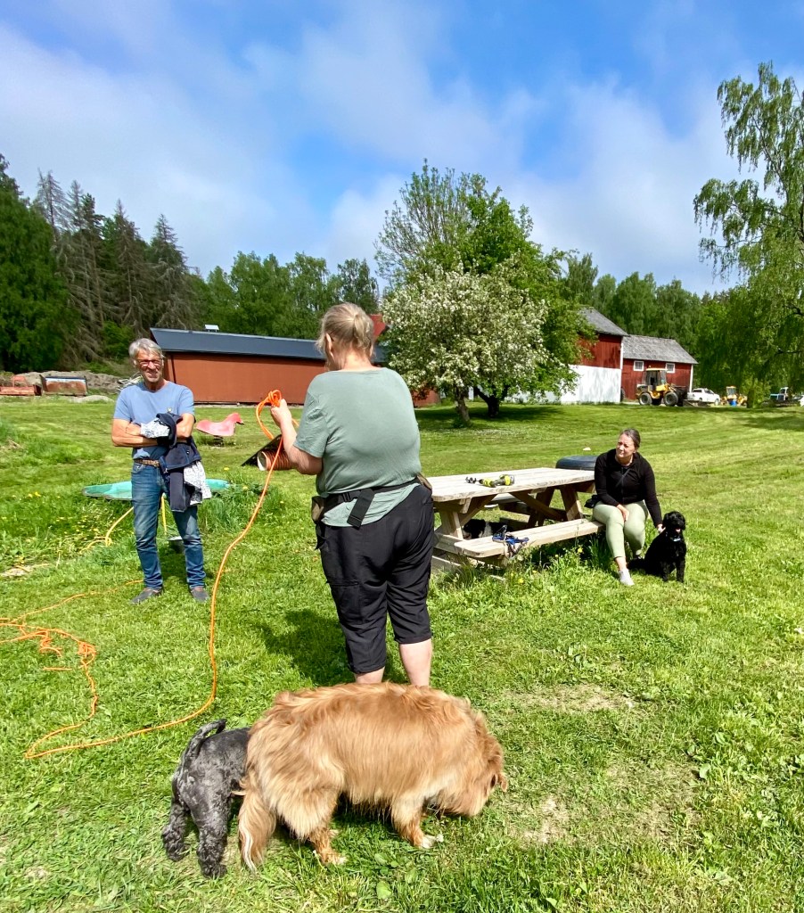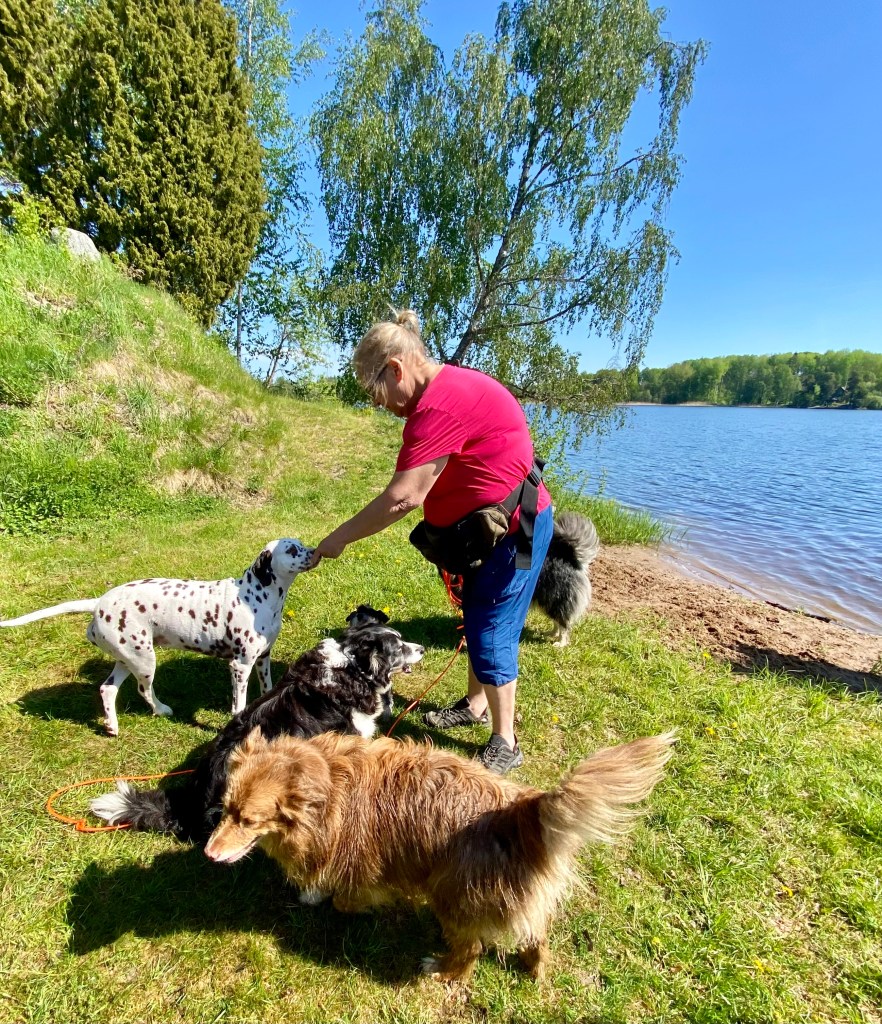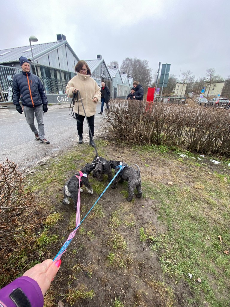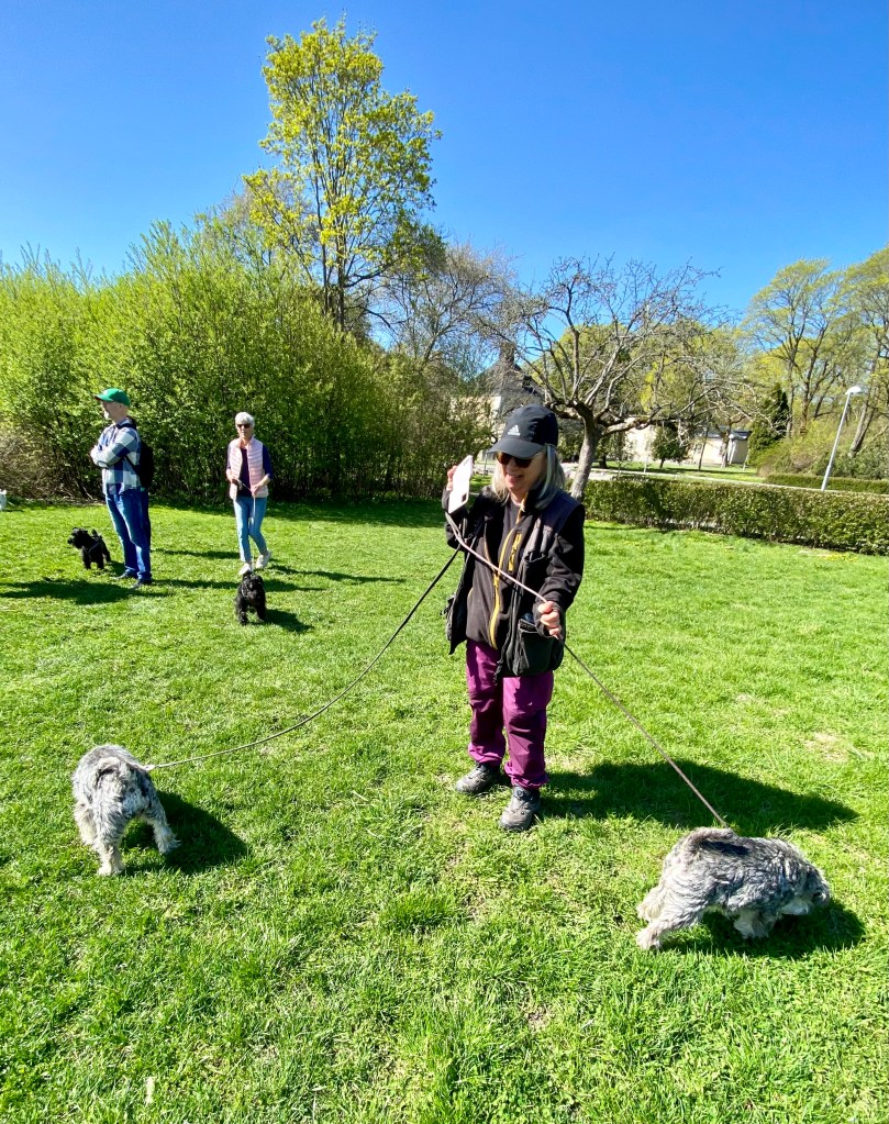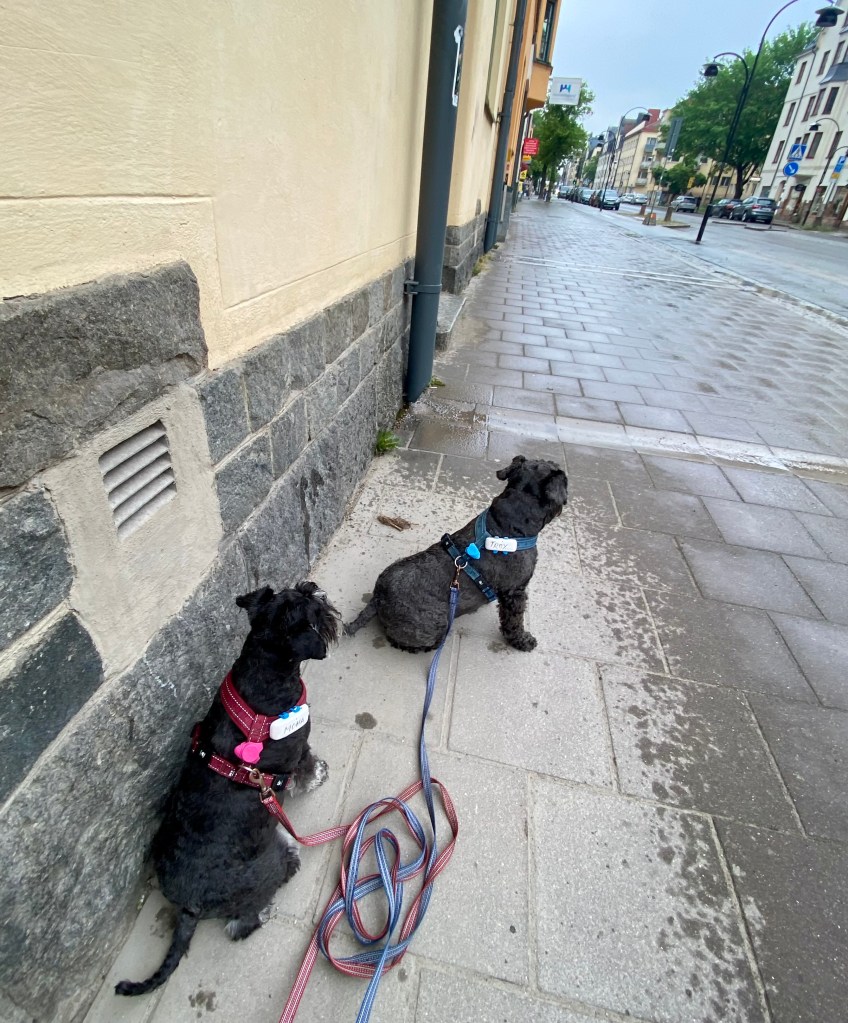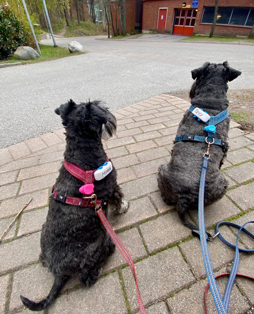 Så var det dags för ett spår. Helena försvann som vanligt och vi koppelfångar stod kvar hos matte. Detta är riktigt fredagsmys köttbitar och pannkakor mums Mumsfilibabba.