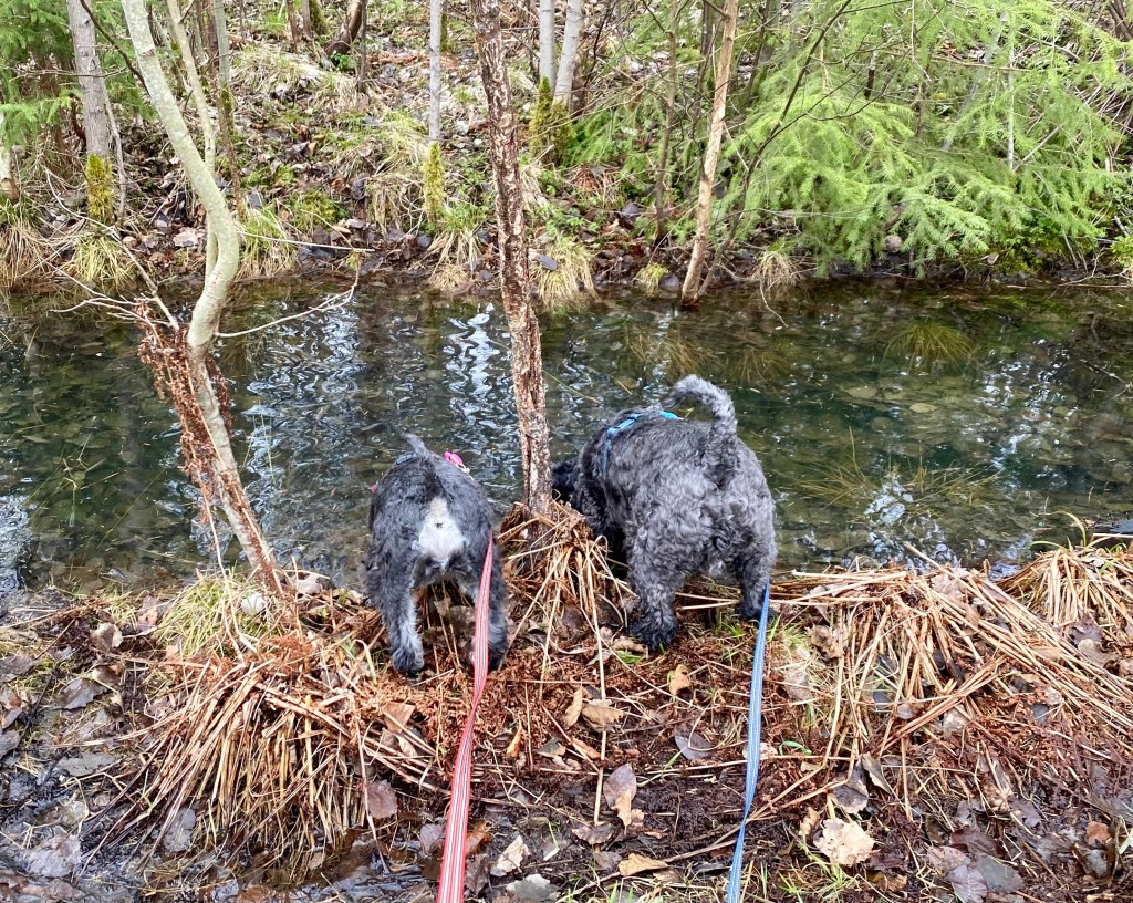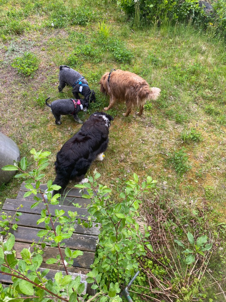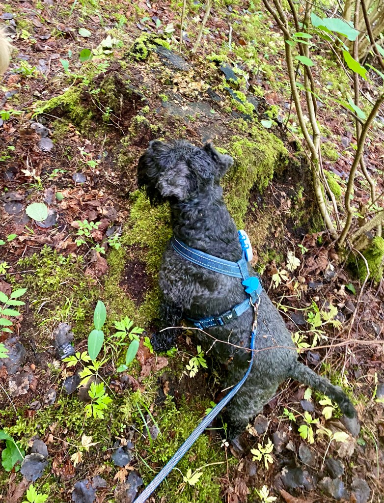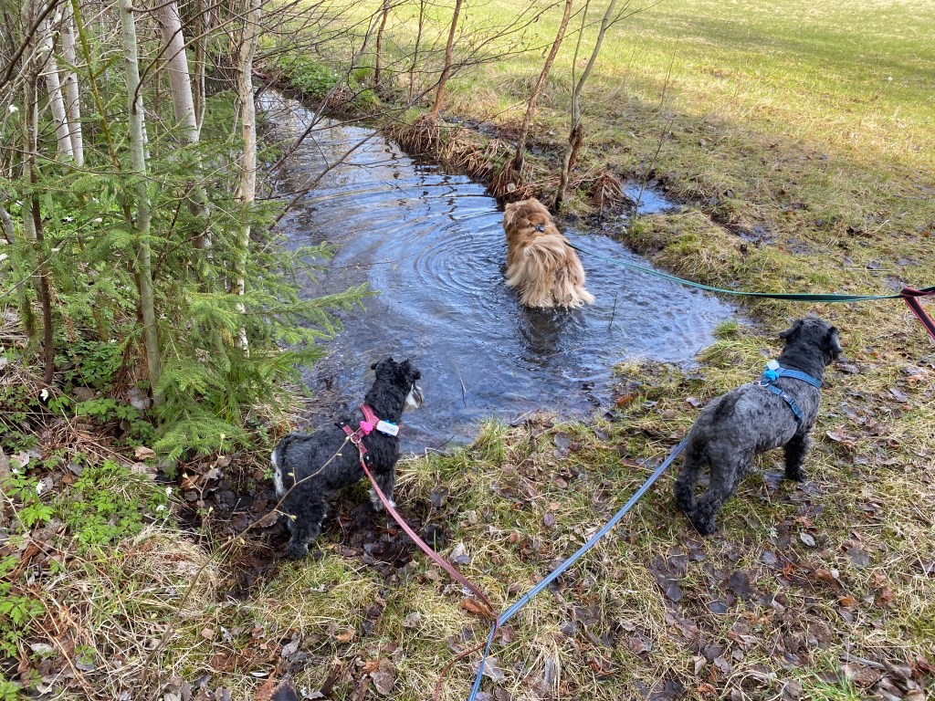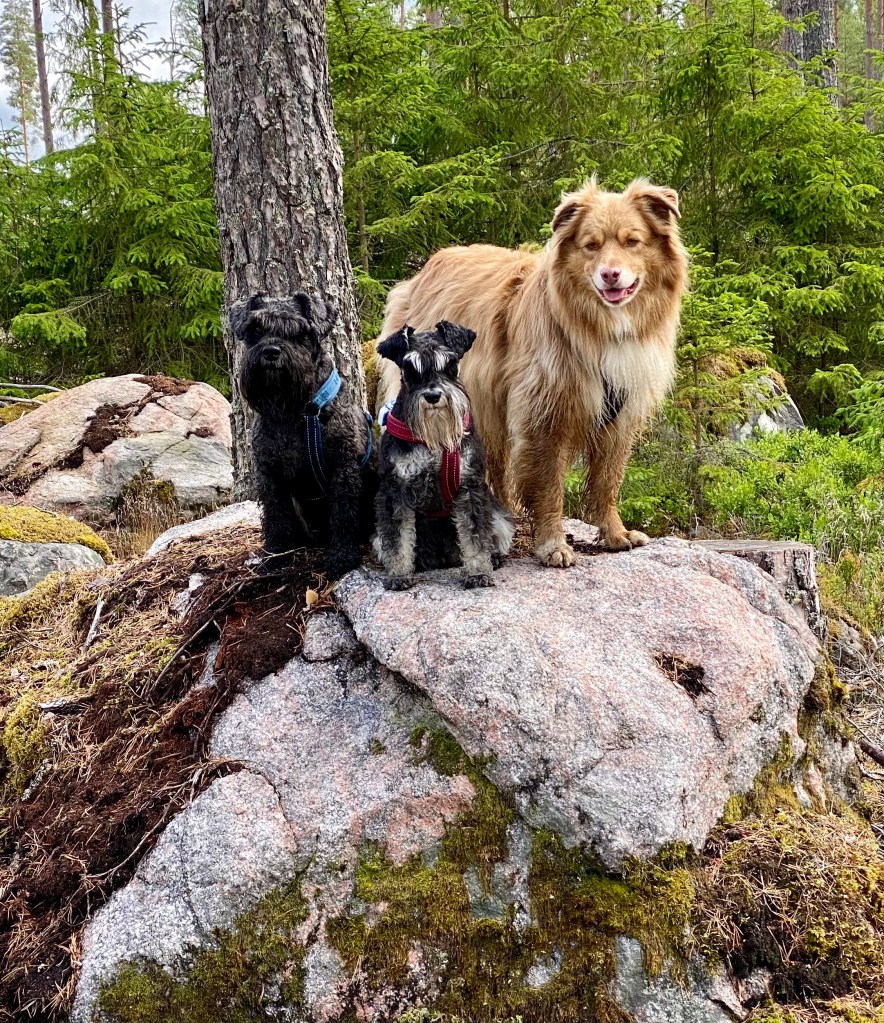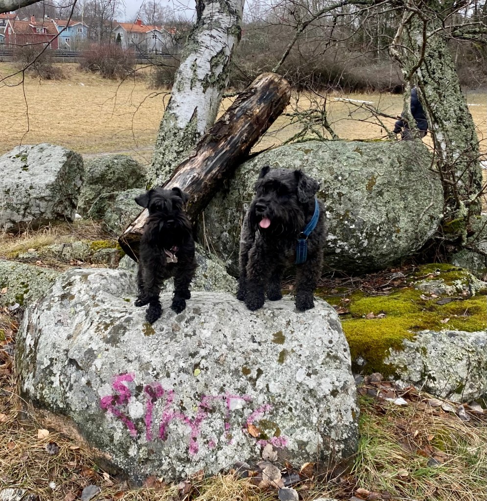 Basse och Troy kutar iväg före, sätter sig på en mossbeklädd sten och undrar om det dags att gå till bilarna nu?