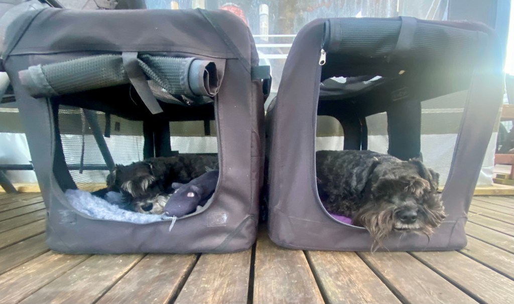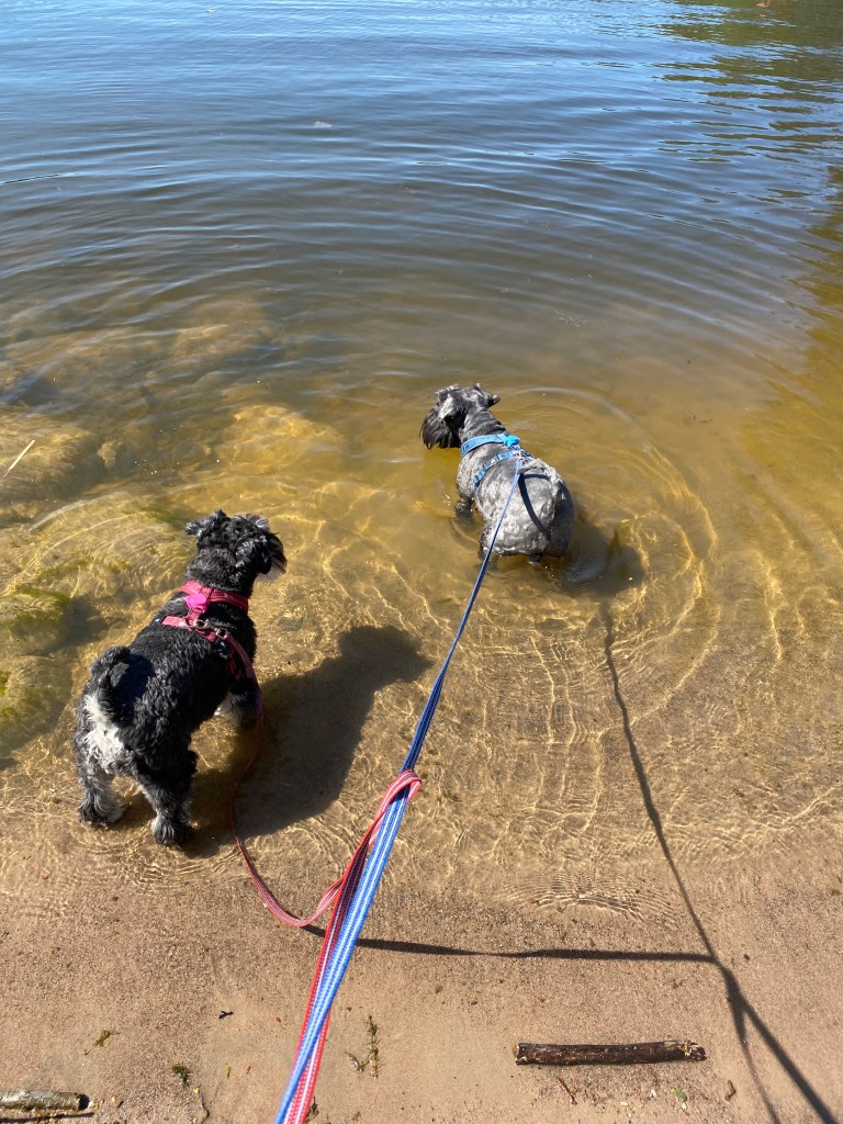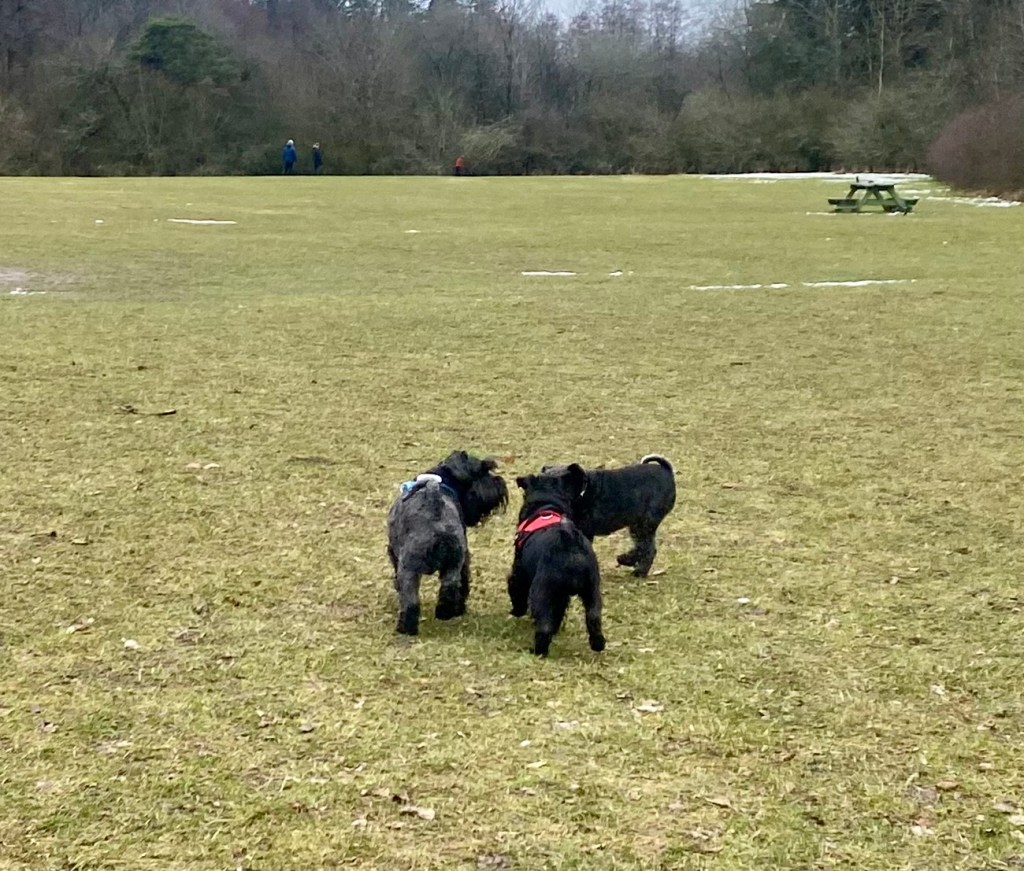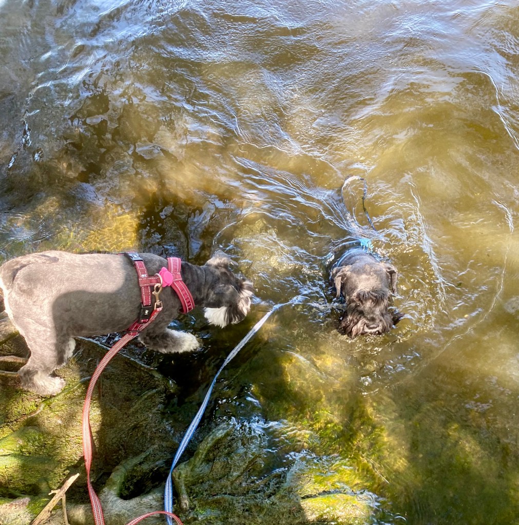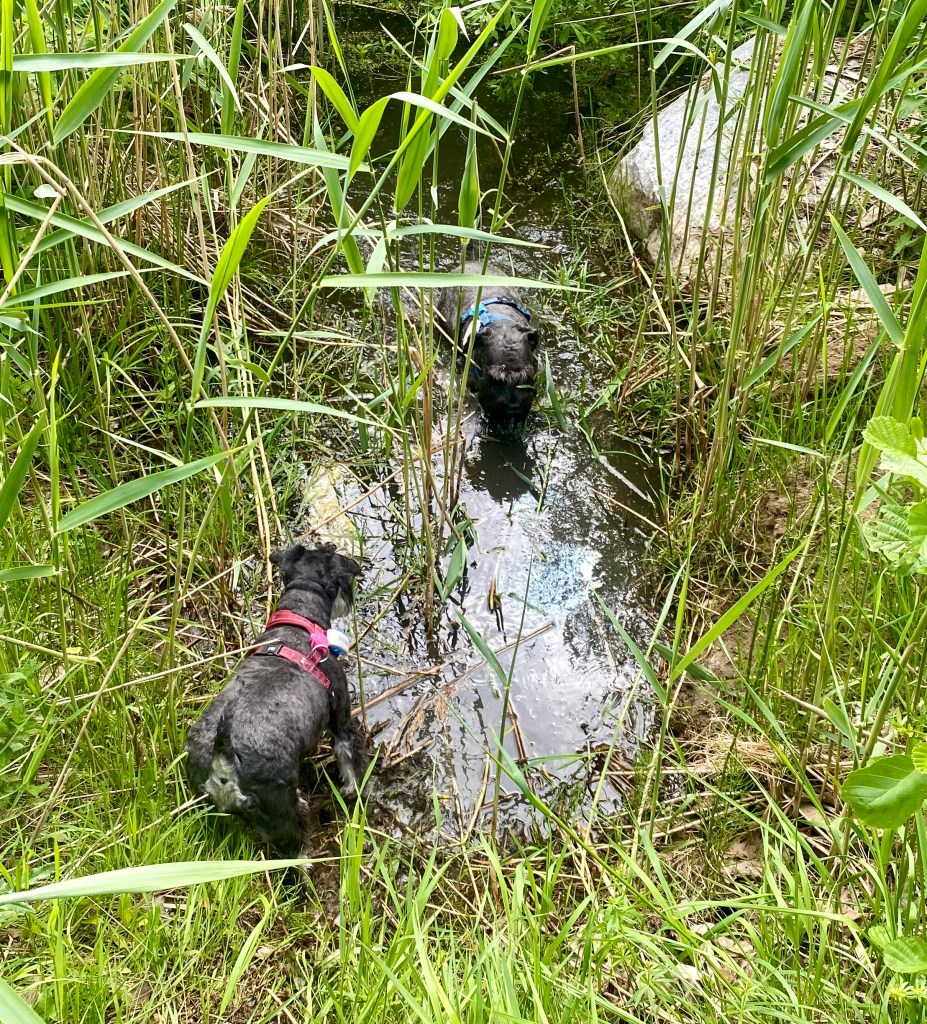 Basse och Troy kutar iväg före, sätter sig på en mossbeklädd sten och undrar om det dags att gå till bilarna nu?