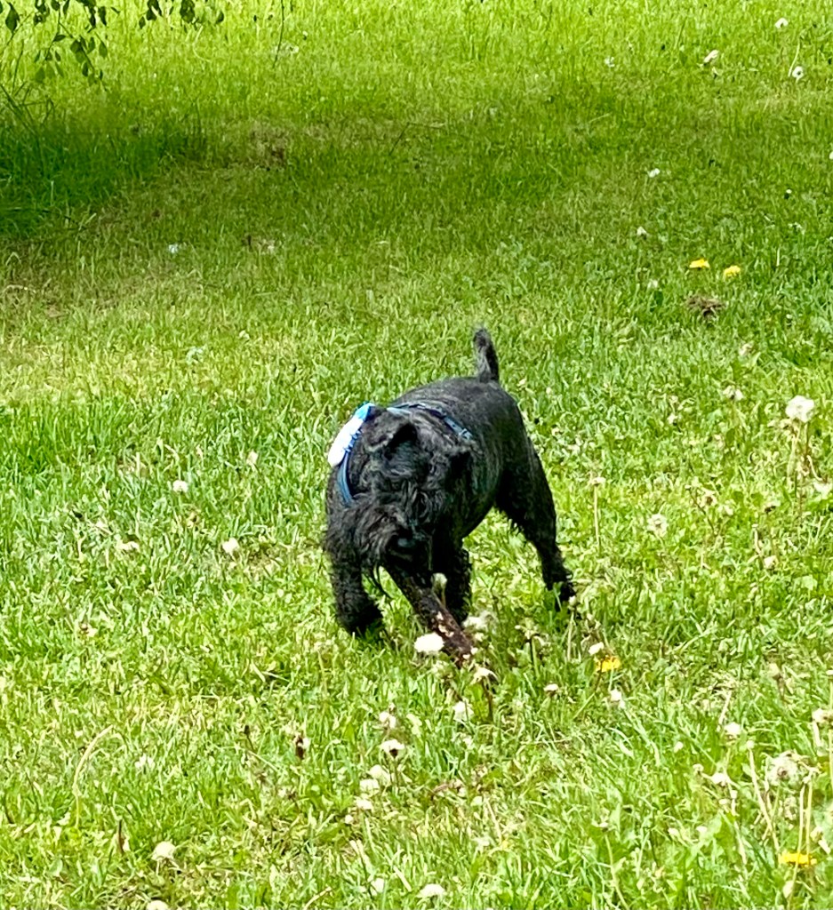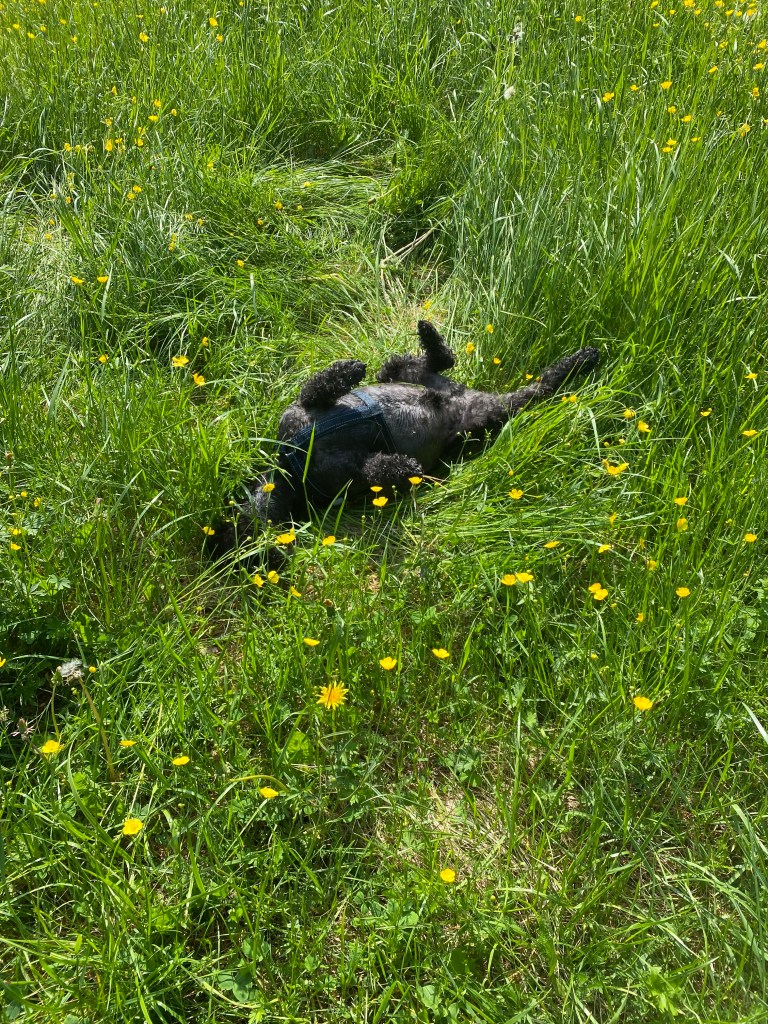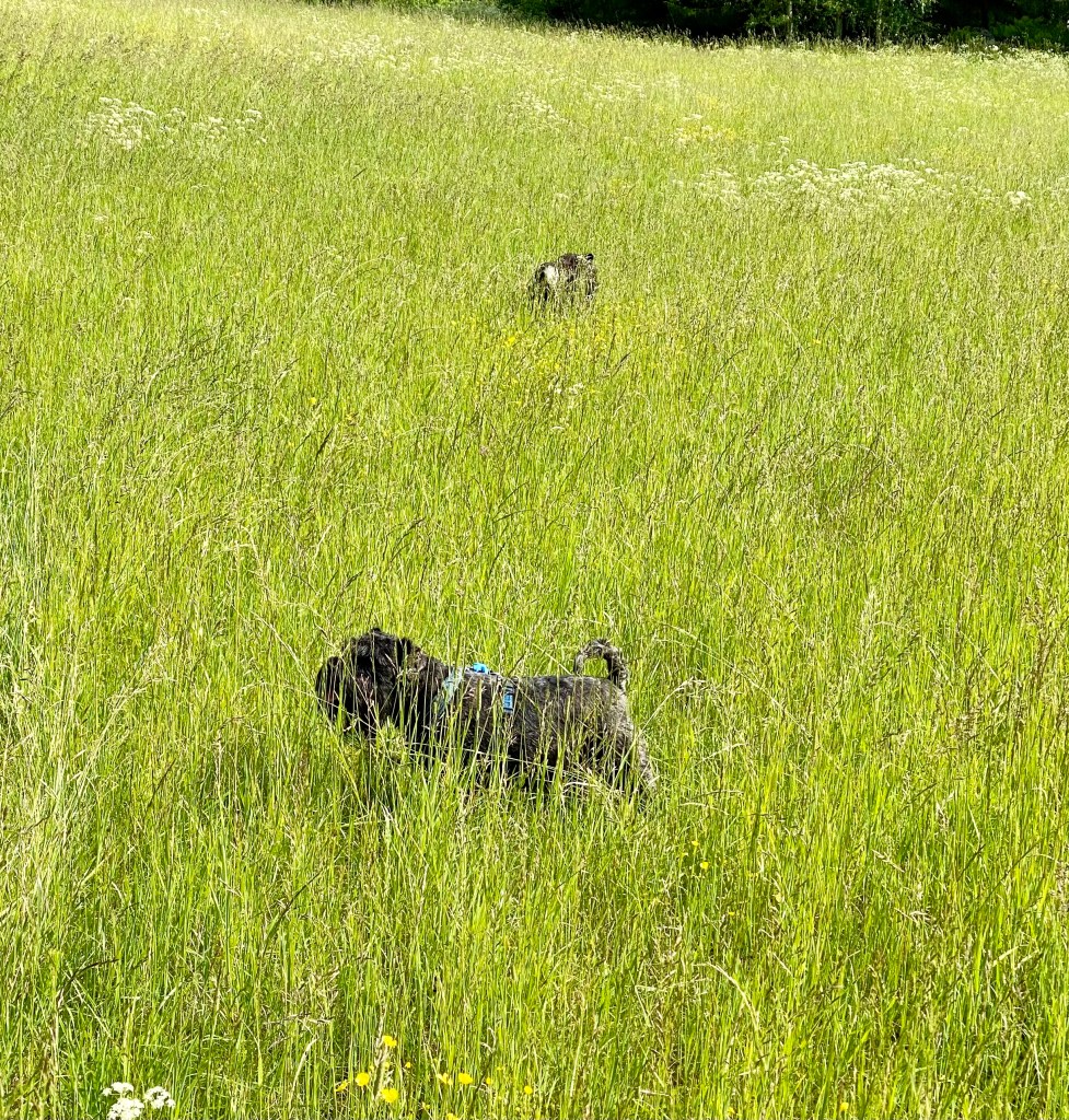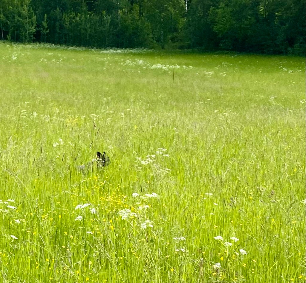 Jösses vad högt gräset var på ängen. Det var jättekul att skuttande rusa fram i med nosen först för att plöja en väg. Kolla Troys öron han kutar så fort att de står rakt upp.