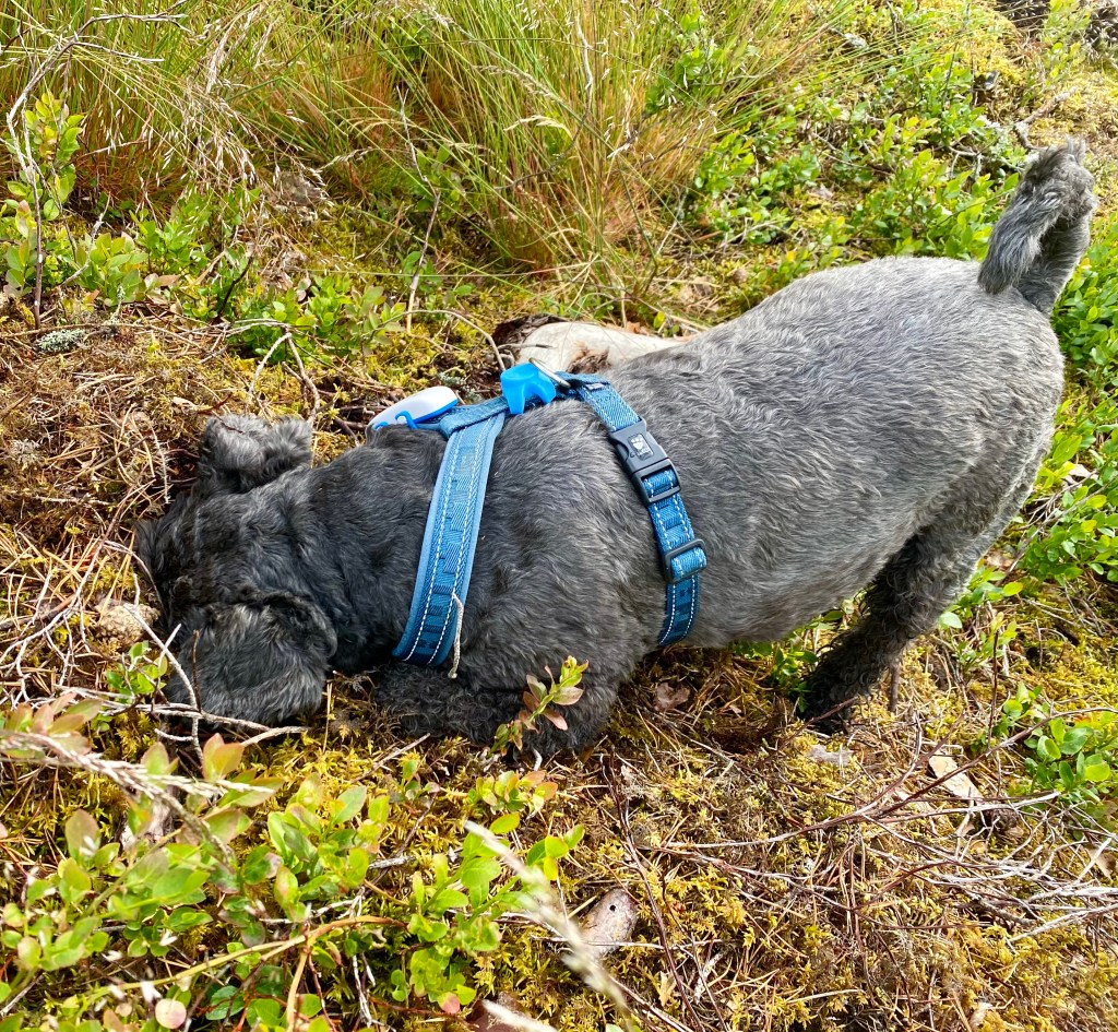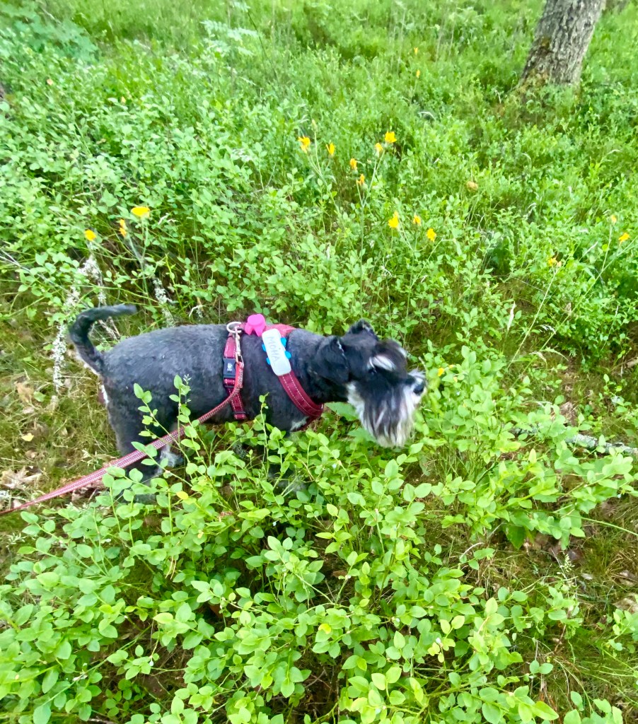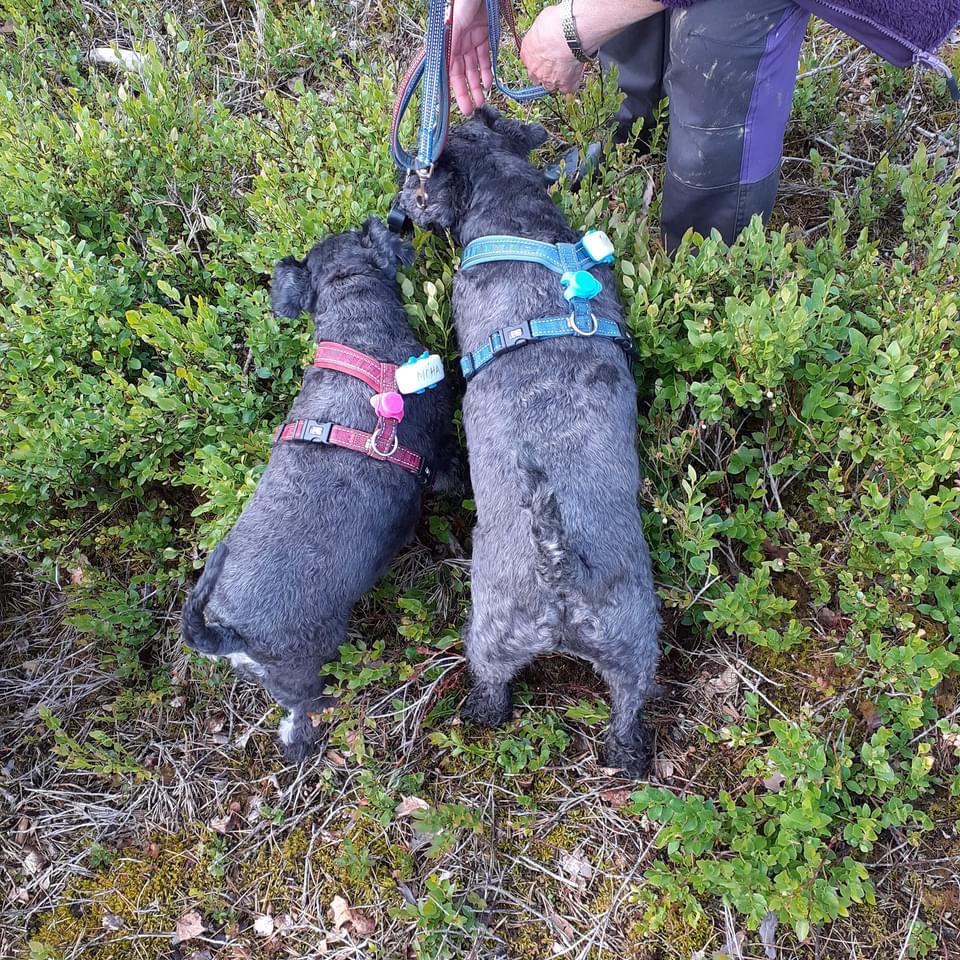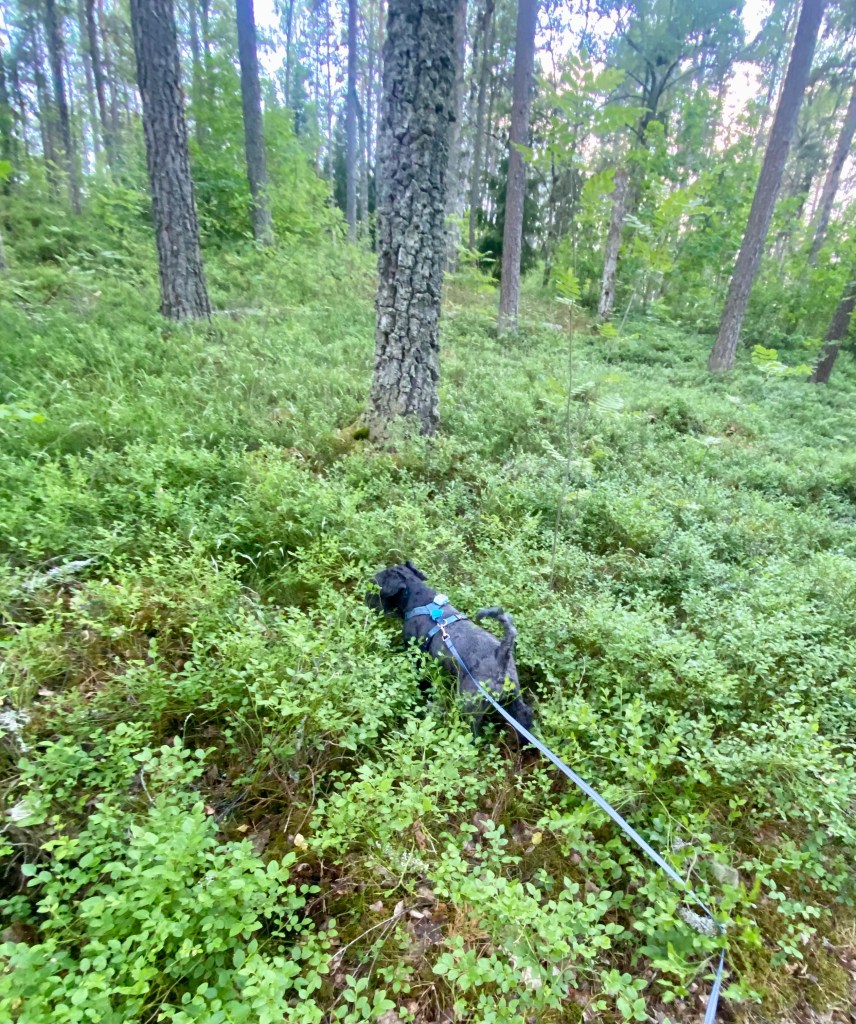 Moha! Troy! Kom och kolla några små mogna blåbär och ett och annat smultron. Åååh snart är det fullt av bär här för jag ser en massa kart.