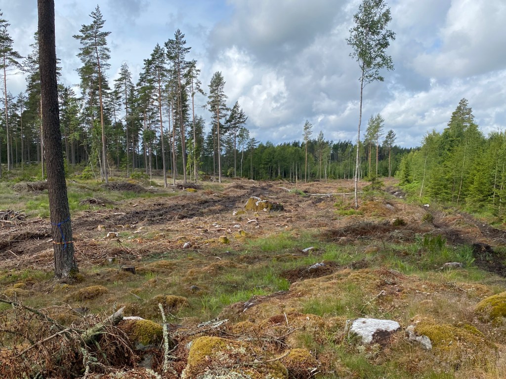 De små sjöarna var borta och likaså alla granar. Lite ledsamt men samtidigt bra att alla dåliga granar som var angripna an granbarkborren var borta. Det var i den här skogen som Troy hittade sin första kantarell.