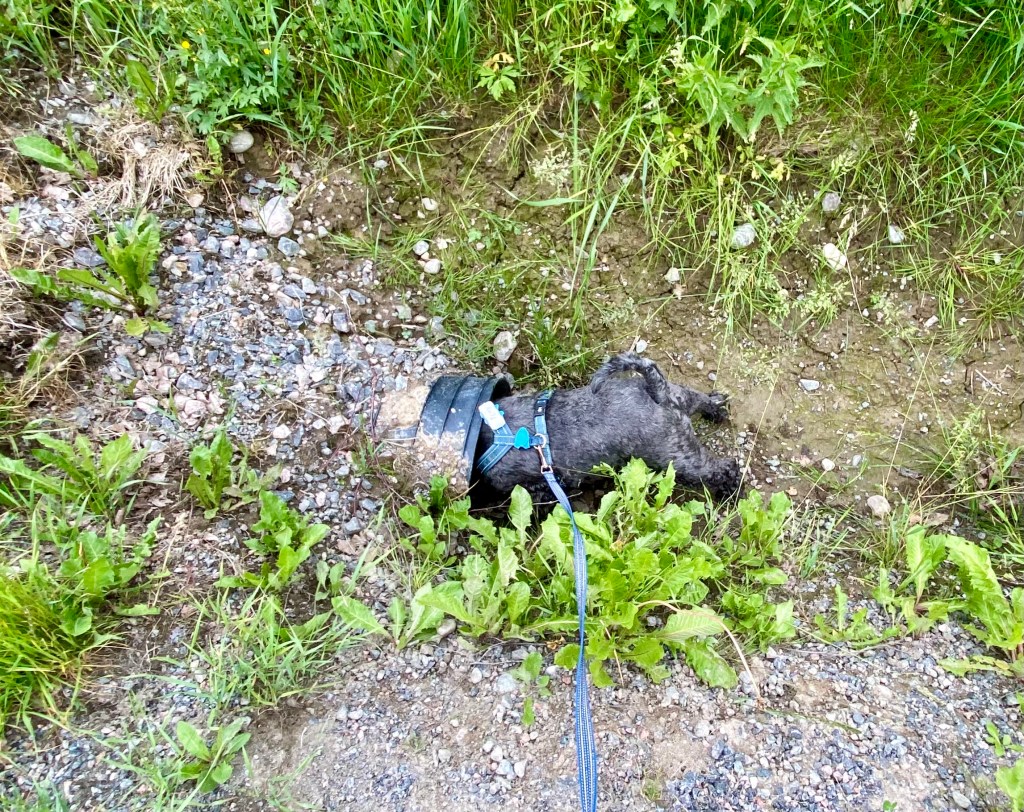 Jäklars dubbeljäklar jag han inte ta den lilla urslingen som rusade in i röret. Matte håller emot för allt hon är värd när han försöker kuta in i röret. Attans vad du är stark säger matte men hon avgår med seger till Troys förtret.