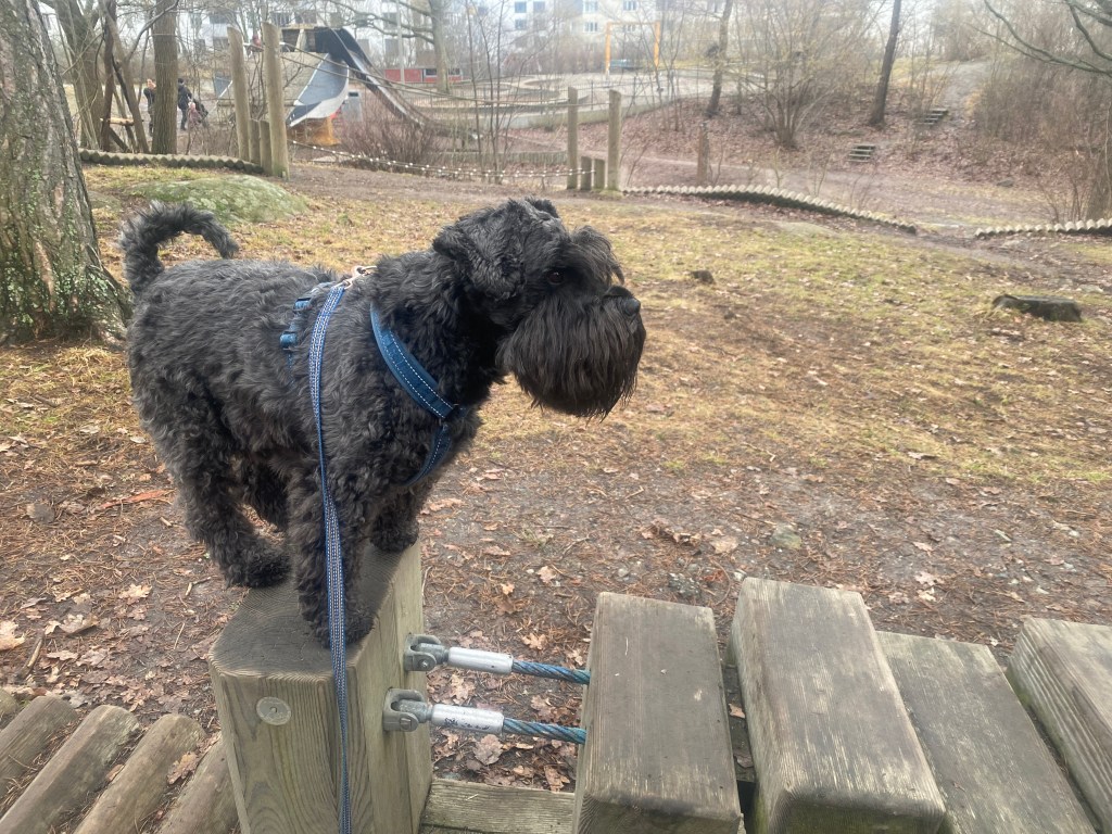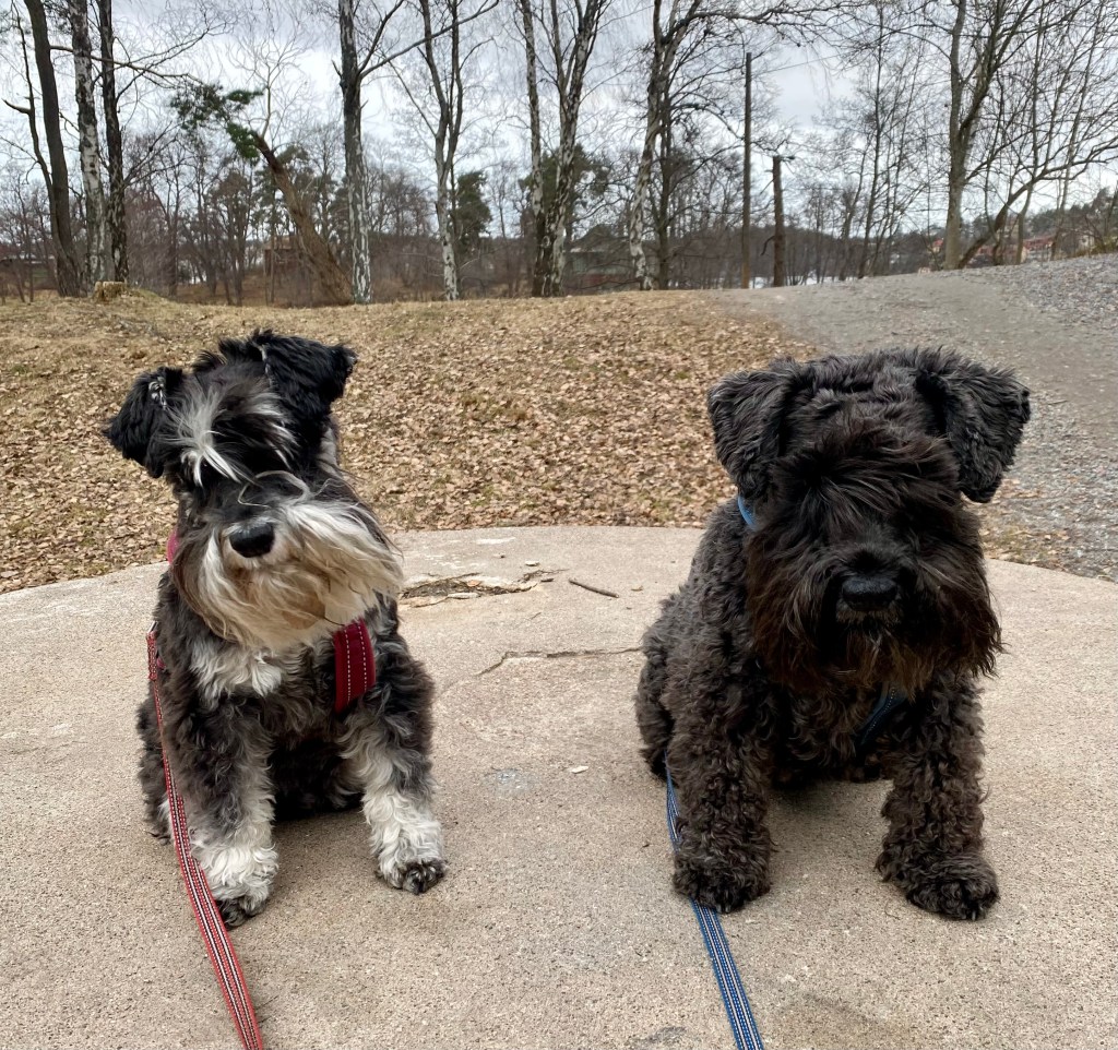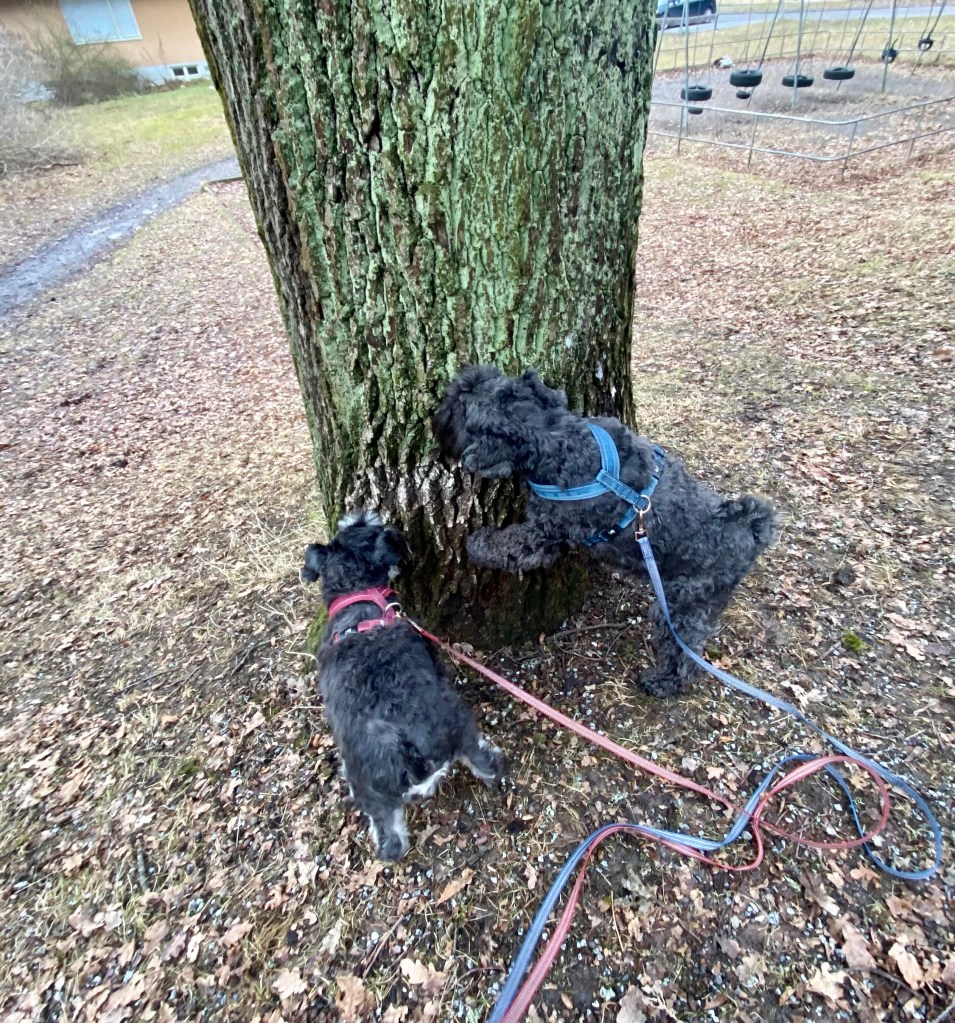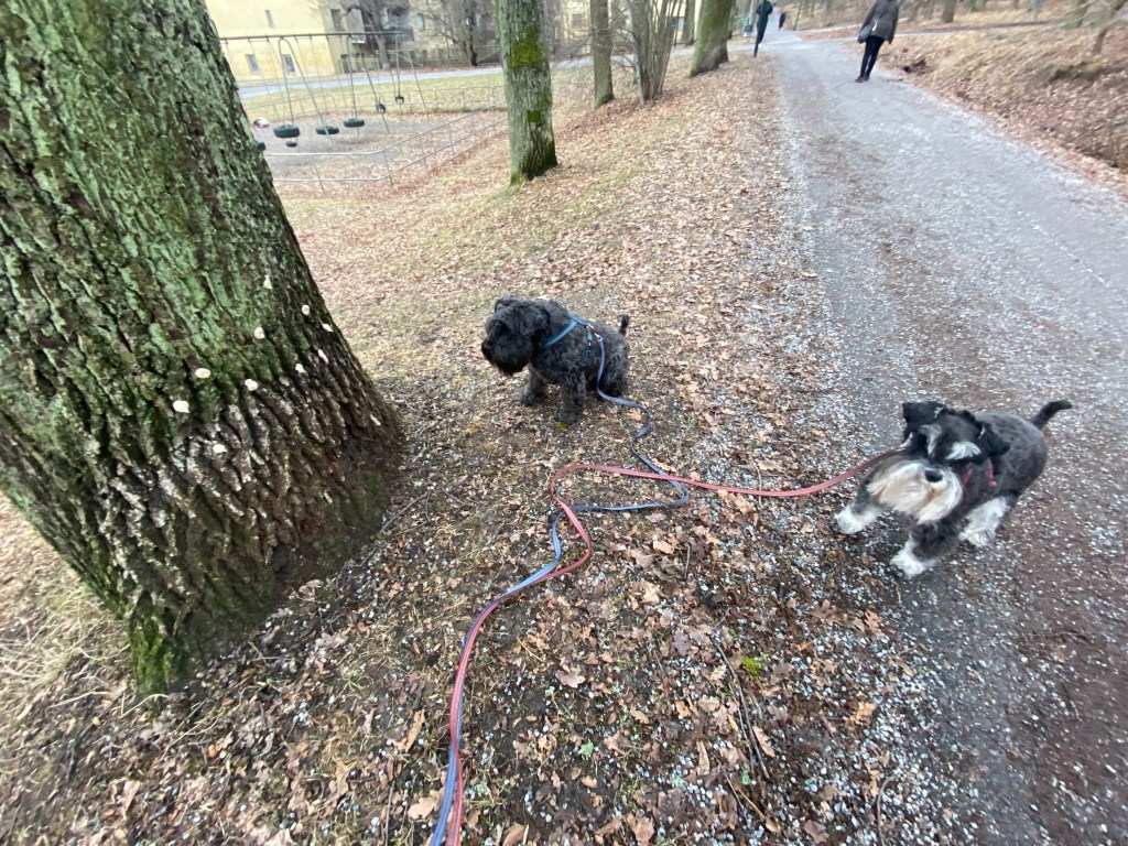 Nu tror jag att alla tvåbeningar har blivit tokiga. Mattes städdille smittar tydligen, här möter vi några som städar och det är ett fasligt liv. Men de är hyggliga människor för de stänger ned maskinernaså vi kan passera i lugn och ro.