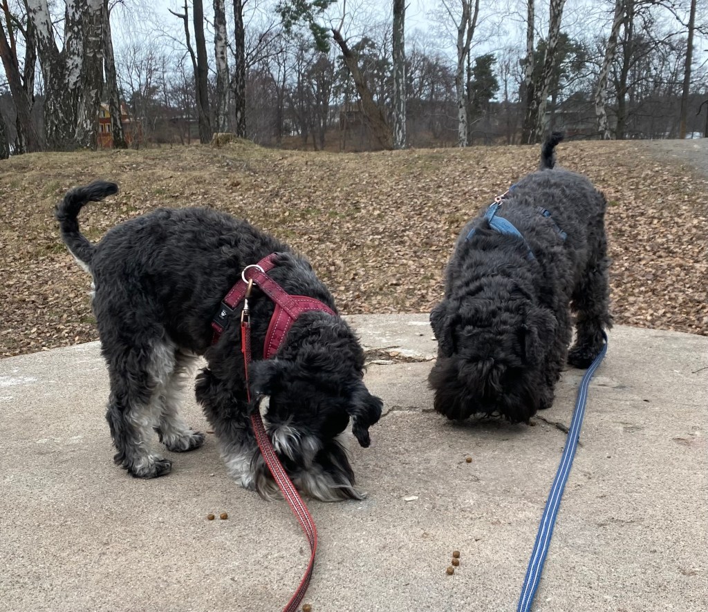 Alla vovvar fick varsin tallrik. Inget gruff bröt ut fast vi smakade lite på varandras tallrikar. Tvåbeningarna tyckte det var konstigt att pannkakorna gick först! Helena hade gjort dem särskilt för oss inget, socker eller salt och de smakade förträffligt.
